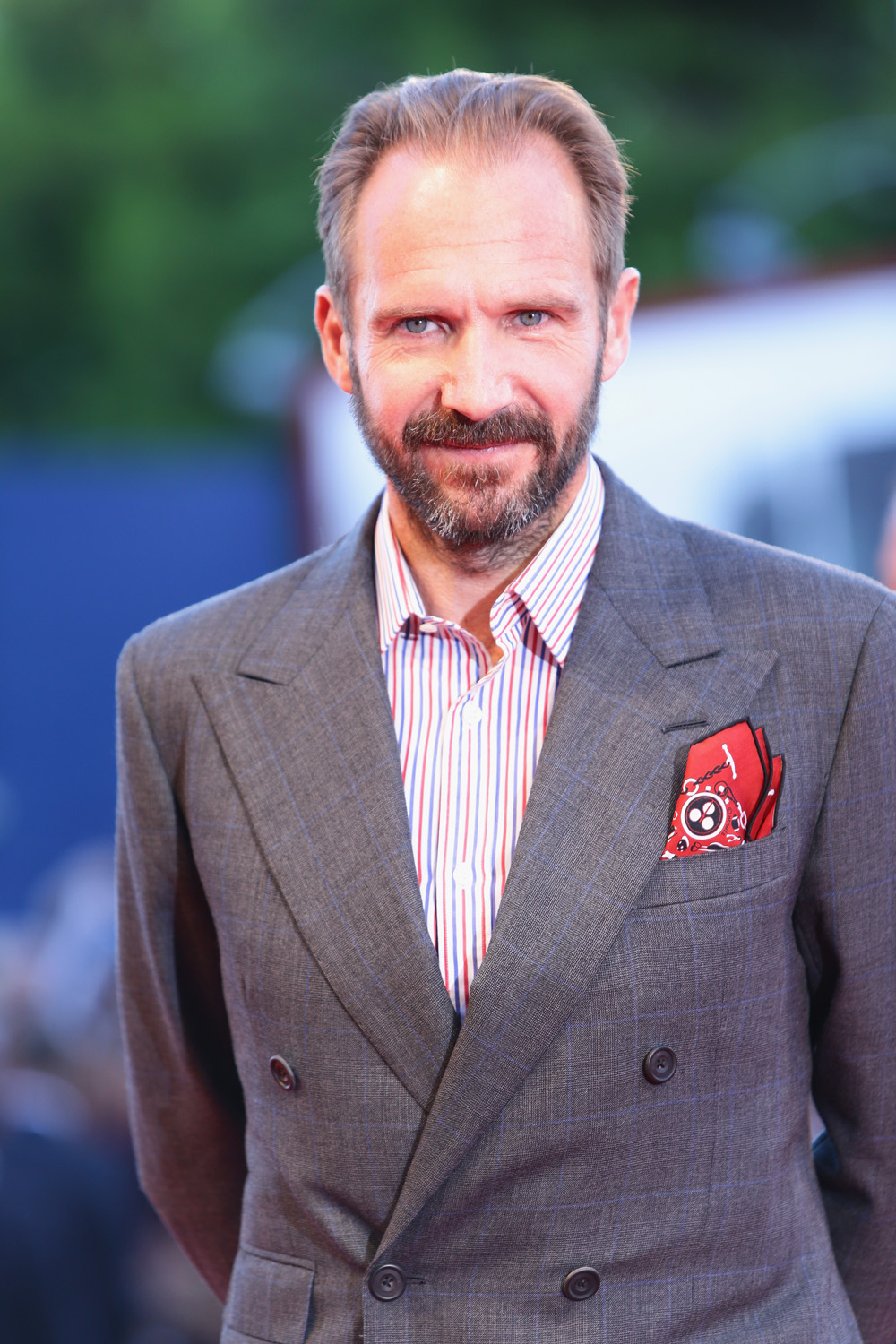 E a infrangere le regole del red carpet, senza perdere un grammo in eleganza è anche Ralph Fiennes: sul lido arriva in doppiopetto grigio, camicia a righe e pochette stampata nel taschino. Una scelta che richiede una certa dose di personalità, di cui evidentemente l’attore inglese dispone.