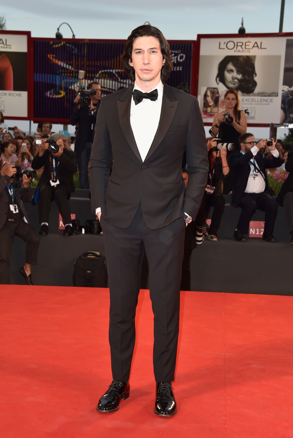 È il caso di Adam Driver e Michele Riondino, le vere stelle in ascesa di quest’ultima edizione della kermesse cinematografica. Il primo, americano, è protagonista di Hungry Hearts,film italiano in concorso per il Leone d’Oro, per la regia di Saverio Costanzo, insieme ad Alba Rorhwacher. Già molto amato in patria per il ruolo dell’eccentrico fidanzato Adam Sackler nella serie televisiva di successo Girls (ruolo che gli ha fruttato una candidatura agli ultimi Emmy) sfoggia un’attitude targata USA anche nelle scelte di stile: il tuxedo è slim fit, il collo è a lancia, la camicia si porta con un papillon in seta, le stringate sono lucide, tutto come impone l’eleganza delle occasioni formali oltre oceano.
