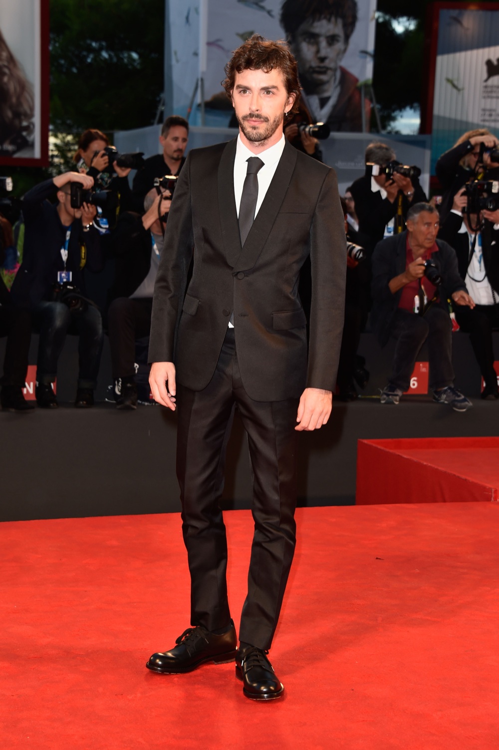 Il secondo, classe 1979, dopo aver interpretato Il giovane Montalbano sul piccolo schermo, affianca Elio Germano nel film di Martone Il giovane favoloso, che ha strappato applausi e consensi tra la giuria del Lido. Aria da marinaio scavezzacollo, à la Corto Maltese, l’attore pugliese ha optato per un tuxedo a due bottoni,dai volumi avvolgenti, abbinandolo ad accessori meno formali del suo collega americano, cravatta in seta e derby lucide, come visto anche sulla passerella di Corneliani. Un approccio easy-chic che prende una virata decisamente rock in occasioni come quella del photocall, dove ha sfoggiato con aria sicura biker e jeans delavè con stivaletti in nuance, tutto Emporio Armani.