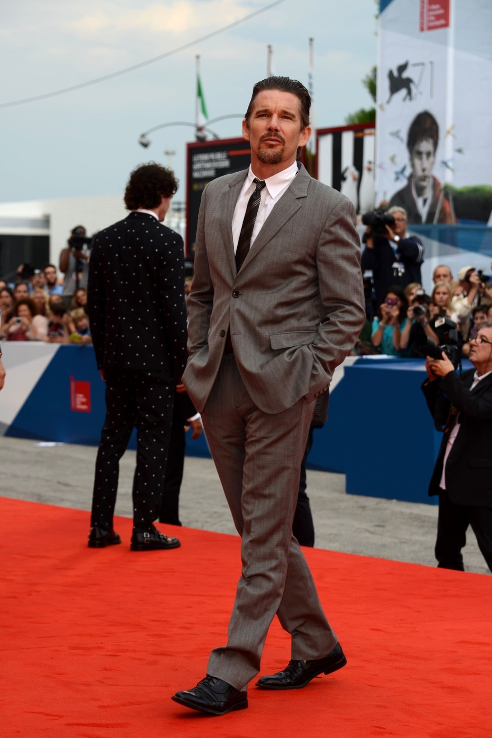 Giovani emergenti dai vezzi modaioli ma non solo. Ethan Hawke ha calcato il red carpet per presentare Cymbeline, adattamento dell’opera shakesperiana Cimbelino, diretto da Michael Almereyda, di cui è protagonista. E ha dimostrato come la classe aumenti proporzionalmente con l’età. A 44 anni, ha sfoggiato un completo greige, dal gessato impercettibile, con cravatta regimental. Una nuance dalla bruciatura nostalgica, sul finire della bella stagione, come quella immaginata per l’autunno da Canali. A cui Ethan ha aggiunto un accessorio unico: un fascino senza età e senza stagione. (guarda anche il fascino di Al Pacino conquista Venezia)