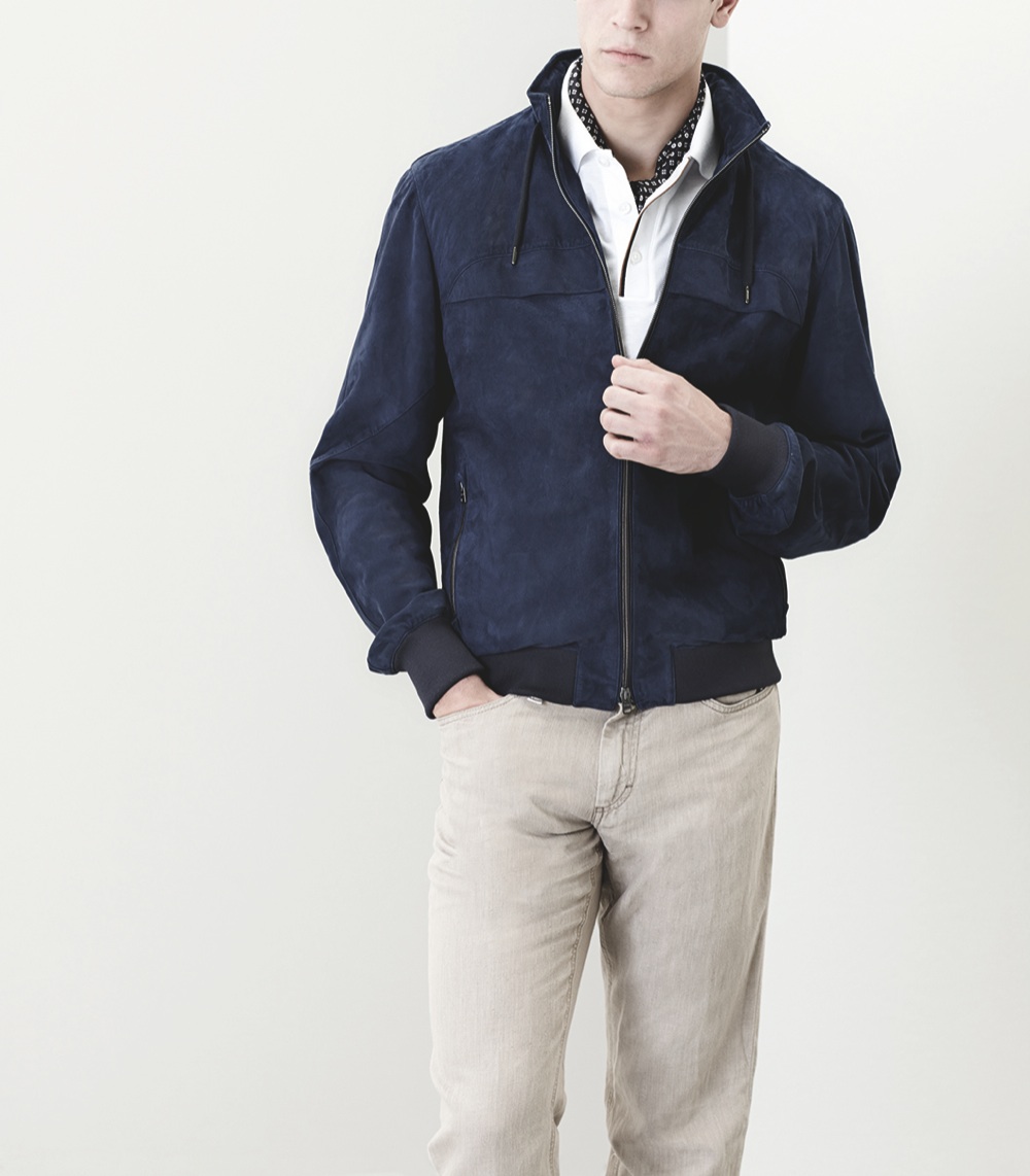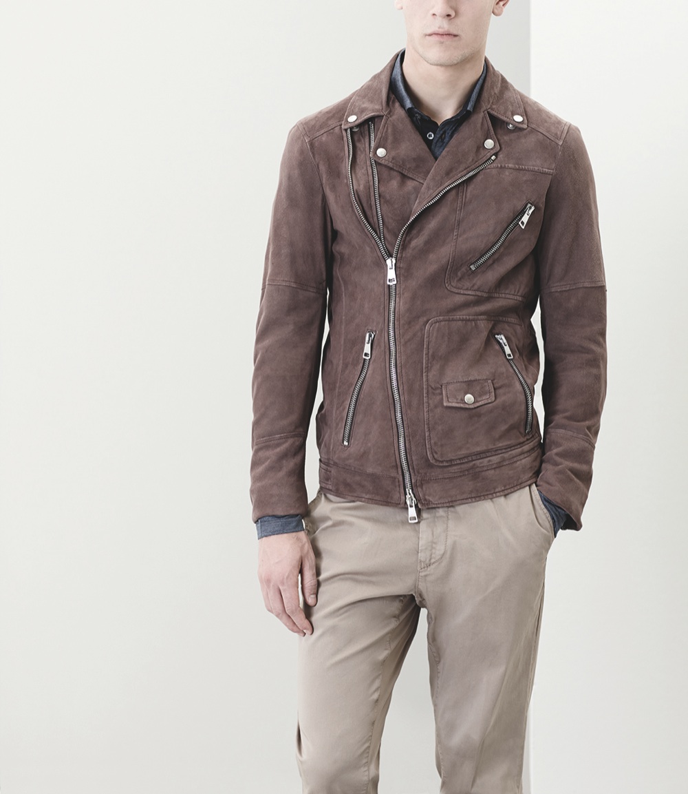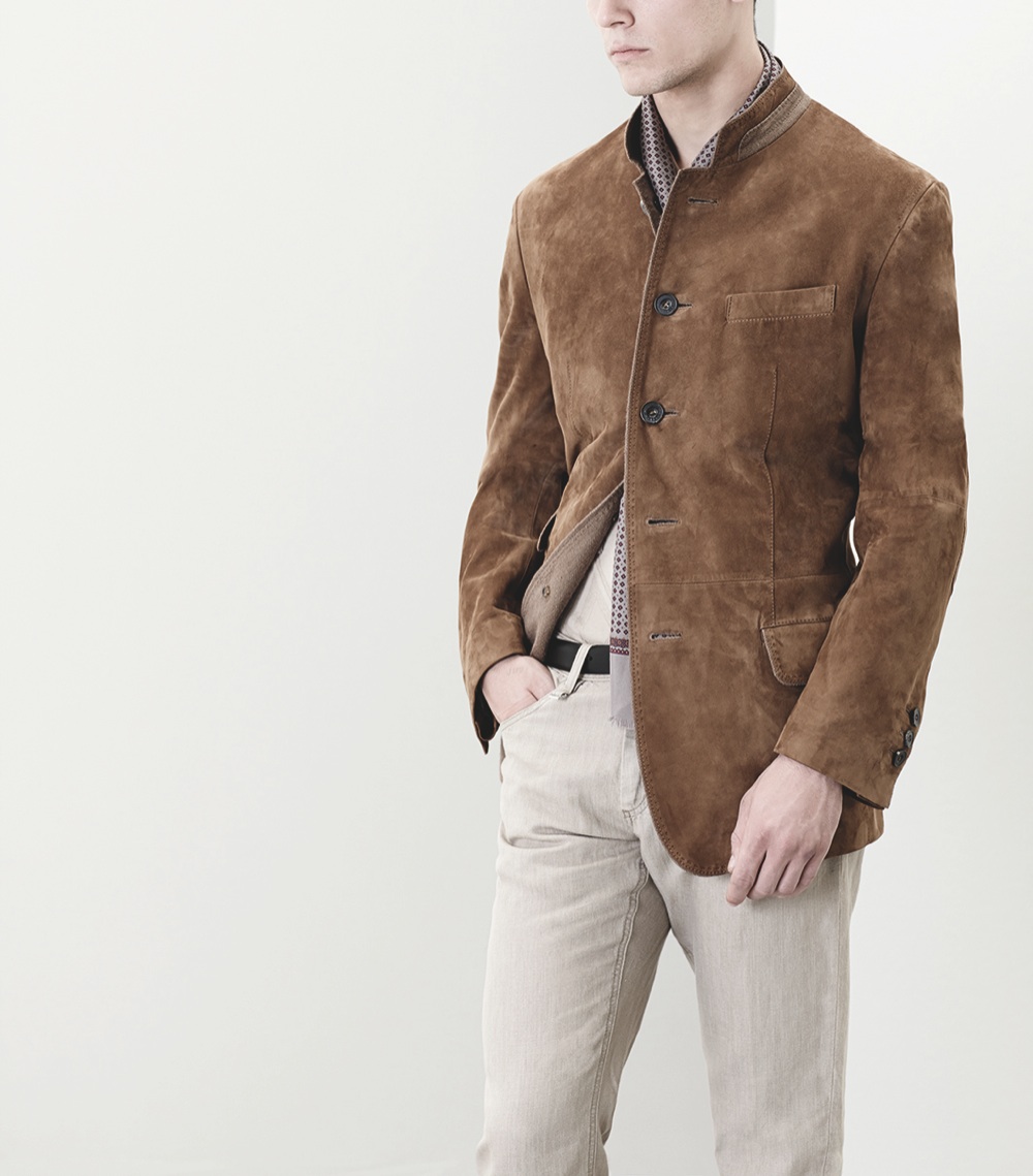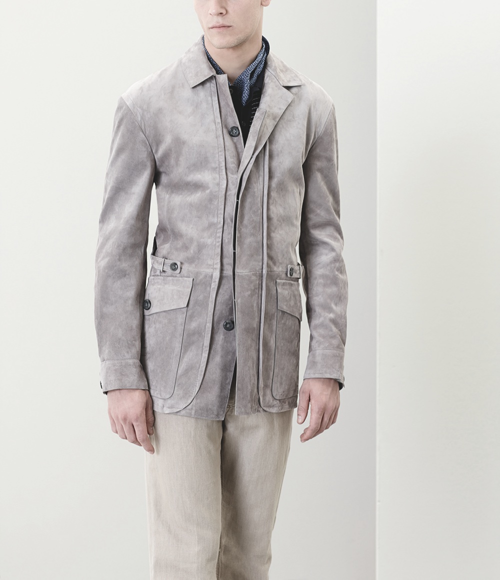 Nel guardaroba maschile la giacca in pelle scamosciata (o suède) è un capo senza tempo. Ma per l’estate 2014 si rinnova e ritona con un fit più asciutto e tessuti più morbidi, leggeri, quasi impalpabili, da indossare sopra a camicia di lino e polo in piquèt di cotone, nelle fresche sere d’estate. Il tessuto si ricava dalla parte inferiore della pelle, la crosta, ottenuta durante la fase di spaccatura che ne uniforma lo spessore.