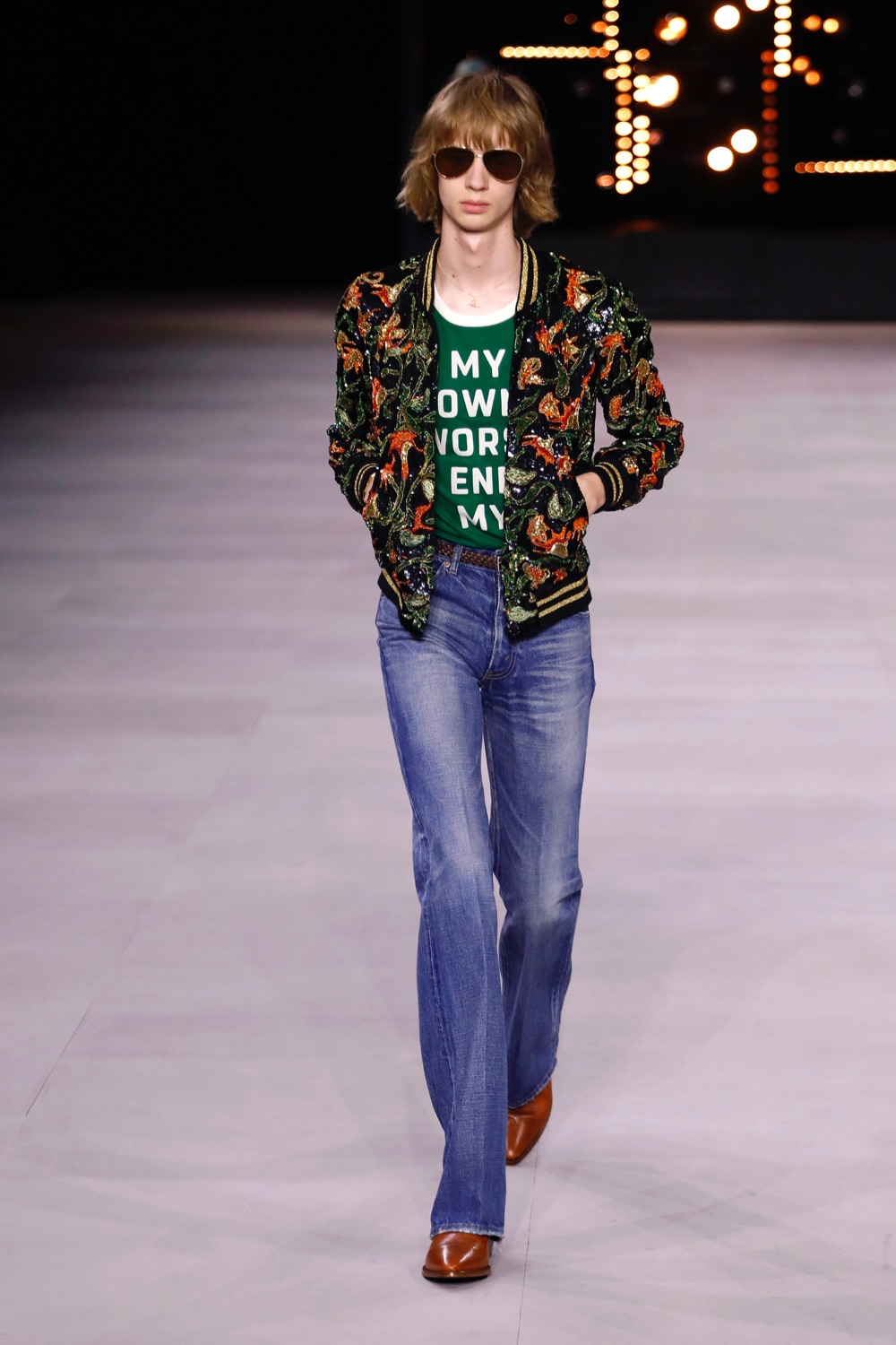 I capi del nuovo guardaroba diventano così tele e pagine bianche che accolgono le frasi dell’artista statunitense. Parole ironiche, autoironismo e riflessione sulla moda oggi si mescolano al racconto dell’uomo secondo Slimane.