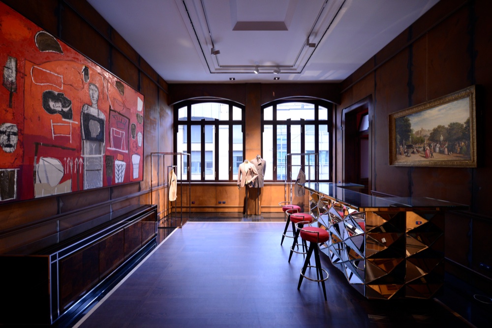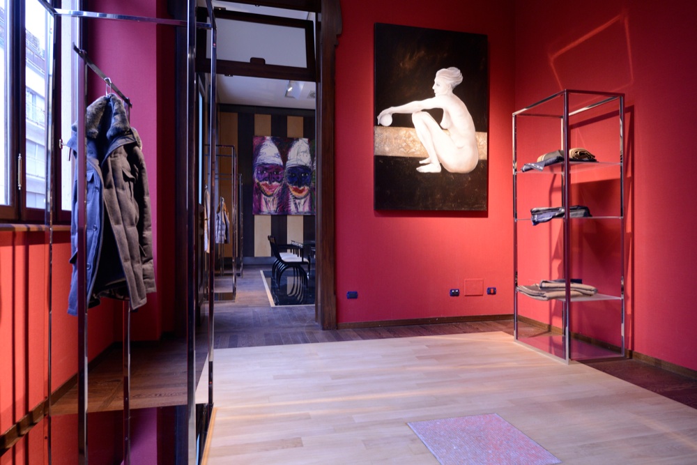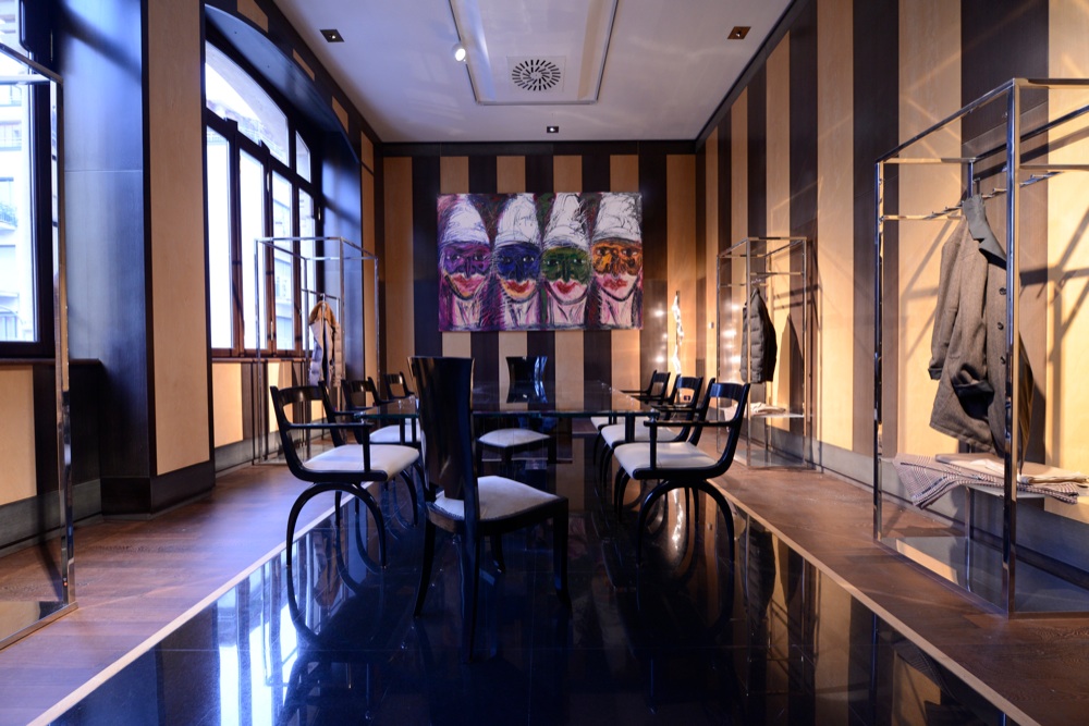 All’inaugurazione gli ospiti hanno potuto visitare il piano nobile e l’ammezzato del palazzo, ma nel 2015 verrà realizzato anche un bistrot e un atelier aperto al pubblico. Grande l’emozione di Ciro Paone, fondatore dell’azienda e sostenitore di questa operazione da circa 30 milioni di euro. Il valore del building nel cuore di Brera è alto e Kiton non ha rinunciato a valorizzarlo al meglio con un restauro interno che ne mantenesse lo splendore originario, aggiungendo alle sale, già imponenti, le opere d’arte della collezione dell’azienda. Come fossero quadri, gli abiti si collocano tra una scultura e un dipinto. Pied de poule, spigati, gessati e l’inedita vicuña double, che vale ben 15 mila euro per una giacca da pinacoteca.