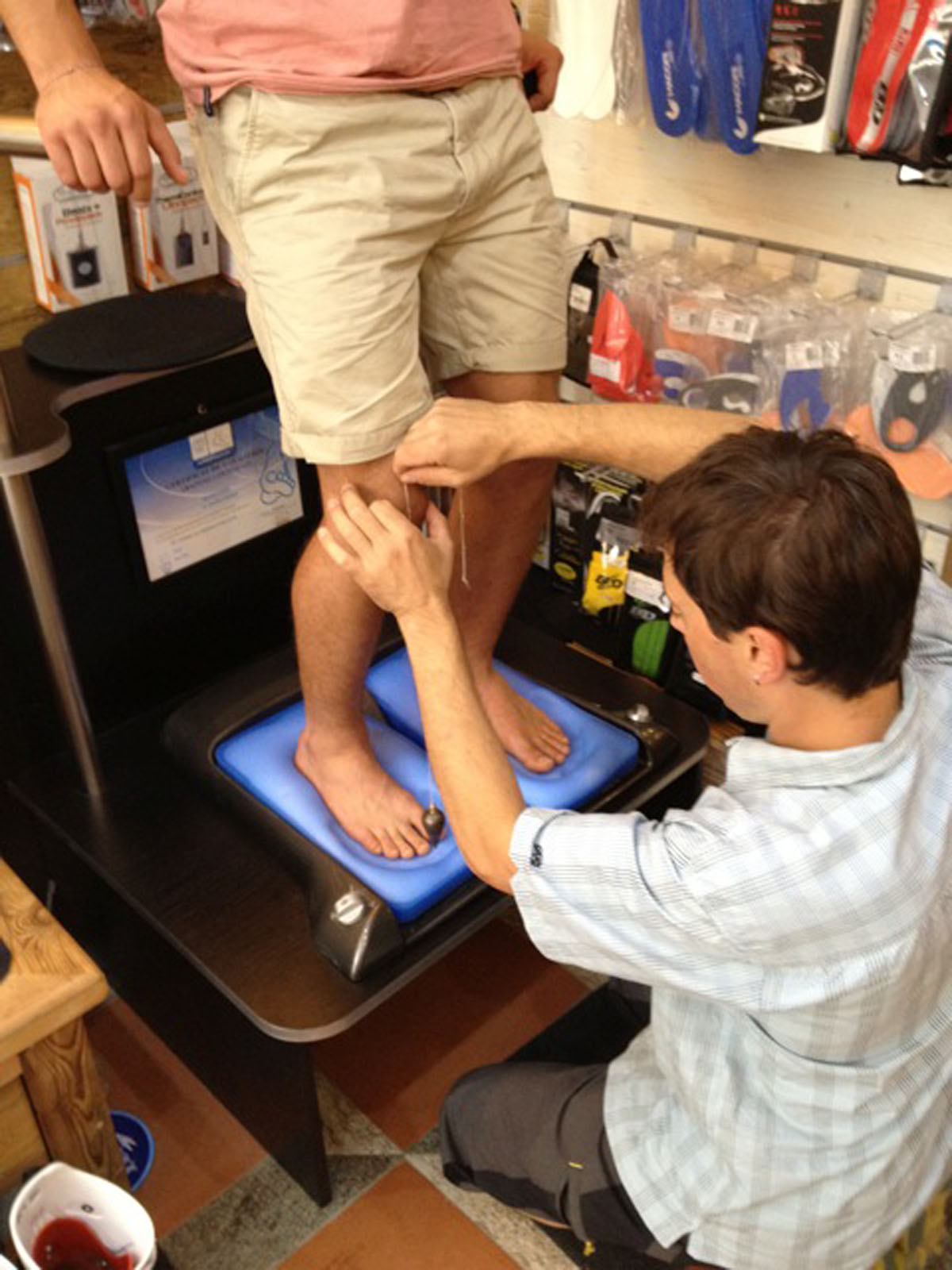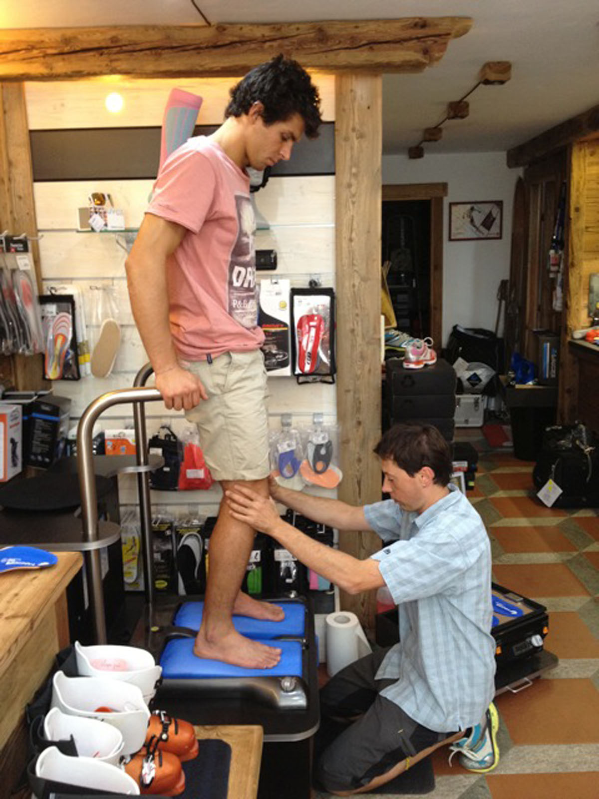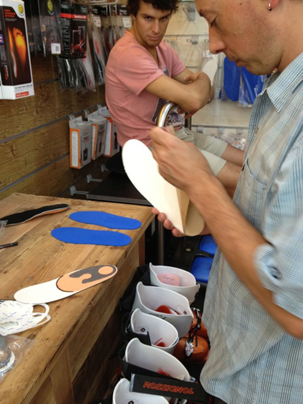 Oggi, con l’aiuto di due assistenti, fabbrica scarponi da sci su misura: “Il primo passaggio”, spiega, “è quello di capire, dialogando con il cliente, quale tipo e che livello di sciata abbia. Se costruisco una scarpa troppo performante rispetto alle capacità del cliente, non gli faccio un buon servizio. Quindi, verifico con un colpo d’occhio quello che c’è bisogno secondo la mia esperienza, poi passo alle misurazioni con il podoscopio. In Italia non abbiamo una grande cultura dell’appoggio del piede, ma è fondamentale. Quindi si sceglie il plantare, di solito preformato e semianatomico, ma possiamo preparare anche plantari ad uso sportivo customizzati al 100%. La seconda fase è quella della scelta dello scafo: ce ne sono di più duri, per alte performance, e più morbidi. Infine si passa alla scarpetta: vuota, viene riempita con un’iniezione di poliuretano e diventa un calco perfetto del piede. Da quest’anno siamo in grado di fornire anche durezze diverse di poliuretano: i campioni come Matteo Marsaglia e Federica Brignone, che assistiamo, li usano duri come legno. Per uno sciatore abile ma amatoriale, meglio rimanere su quelli più morbidi”.