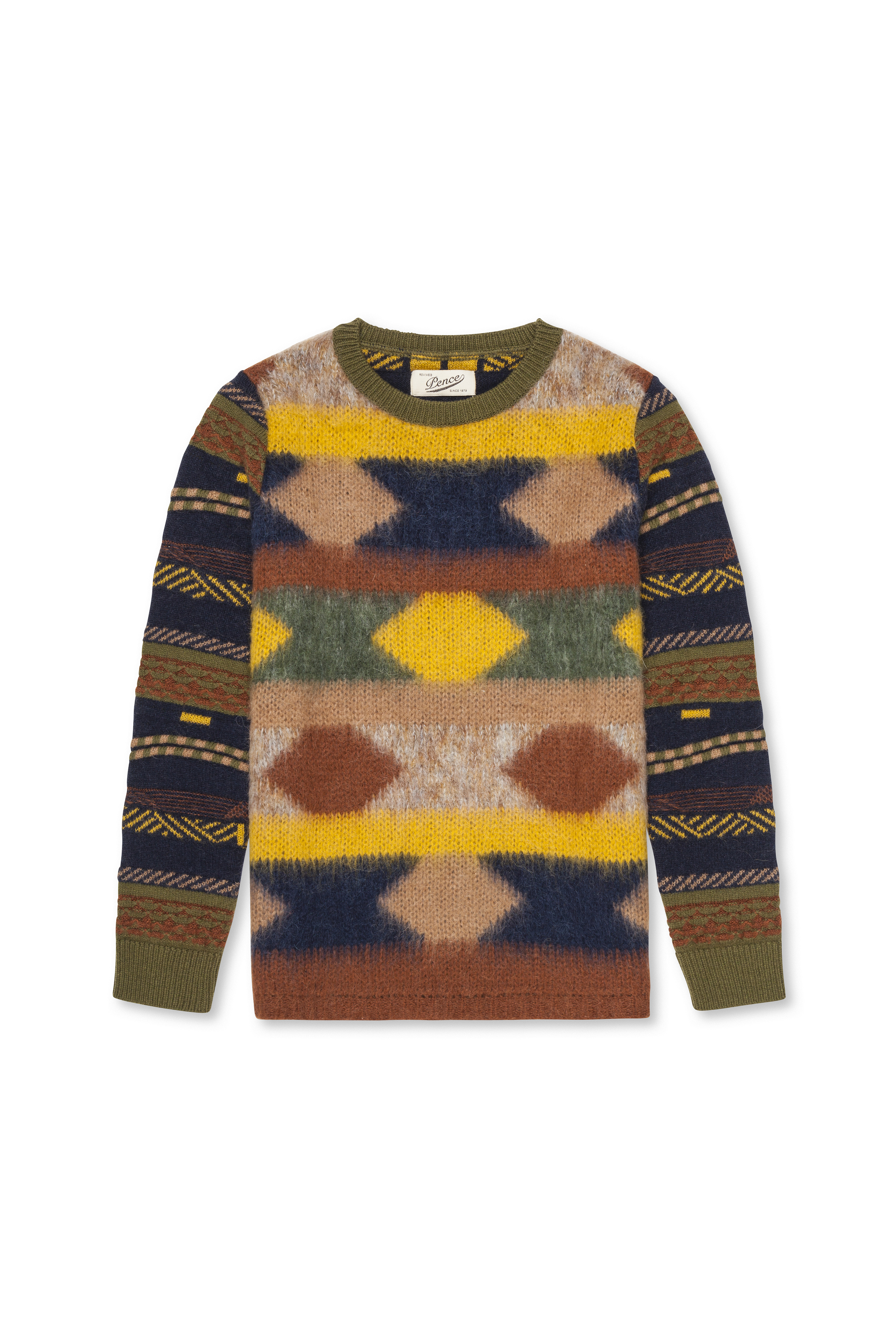 Anche Brooksfield non rinuncia a farsi sentire, il pull in girocollo in filato particolare bouclè in lana vergine fa parte della capsule Slow down for wildlife, un invito a rispettare il ritmo della natura. Con un palette di colori nuovi e delle sfumature della terra, che ricordano la natura incontaminata è la maglia di Pence 1979, in lana jacquard e stampa in fantasia geometrica.