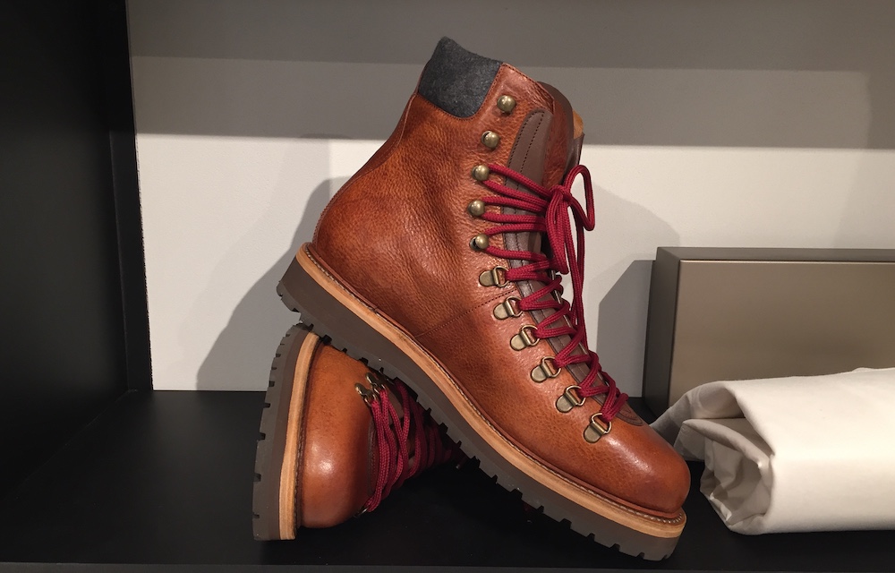 Mountain boots di Brunello Cucinelli, in pelle italiana con lacci a contrasto, suola in gomma carrarmato e dettaglio sulla caviglia in cashmere