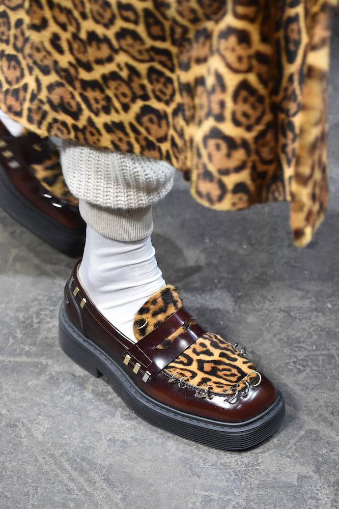 Sulla passerella di Marni gli elementi classici si evolvono: il mocassino è costruito assemblando pellami animalier, graffettati e decorati da anelli di metallo