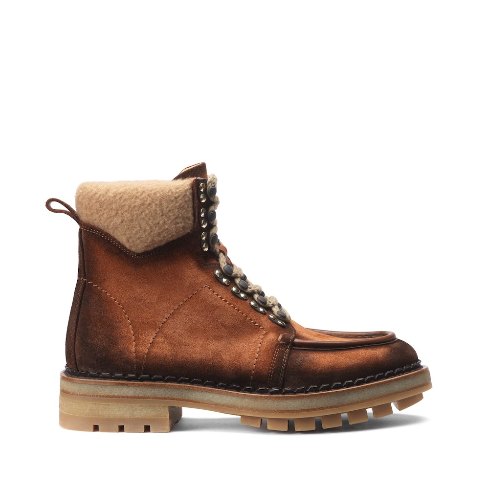 Nella collezione FW 19/20 di Santoni, tra i quattro stili maschili sviluppati, non può mancare l’universo outdoor. Primo rappresentante, questo stivale da montagna in vitello rovesciato, colorato a mano nei toni del bruciato, con ganci e colletto in cammello