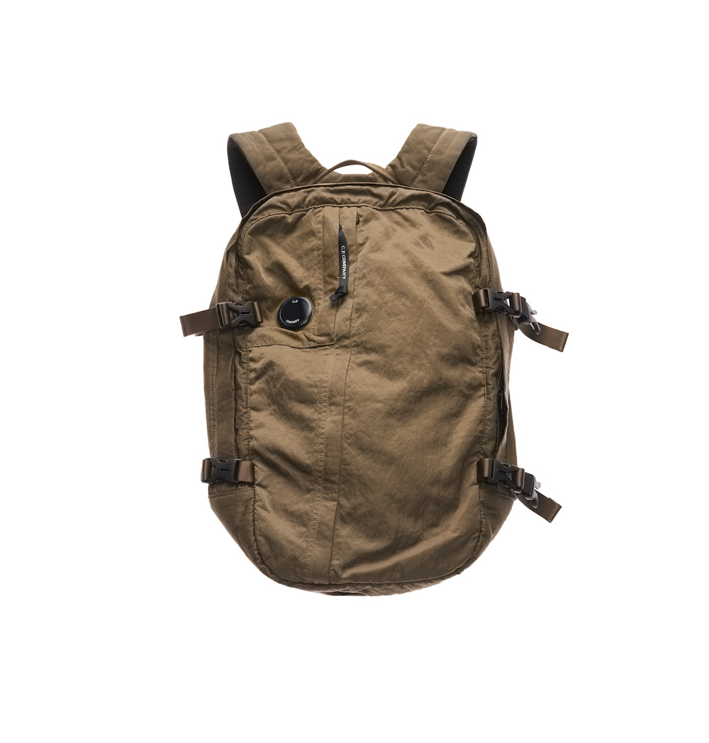 Zaino di C.P. Company, in raso di nylon tinto in capo con cinghie laterali e tasca esterna con la lente iconica della Goggle Jacket