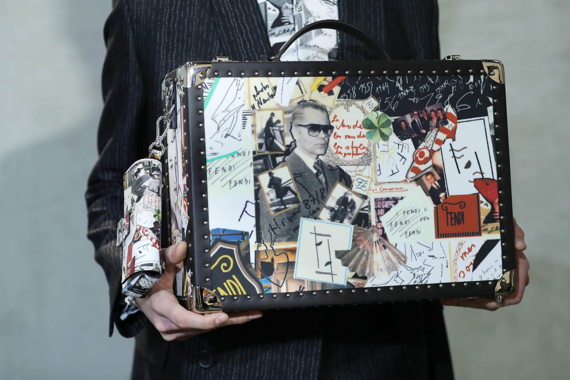 Per le valigie di Fendi è stata creata una stampa collage, assemblando le note e le immagini che Karl Lagerfeld ha inviato a Silvia Venturini Fendi nel corso degli anni