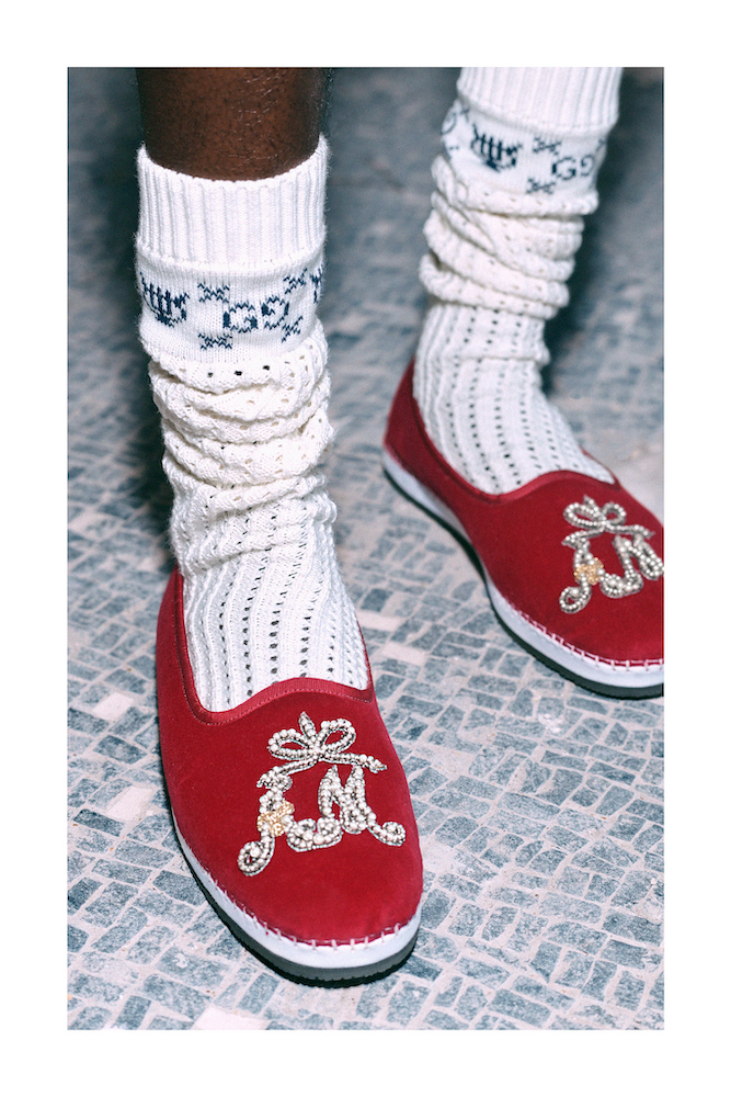Tra le presentazioni di Milano Moda Uomo, anche Gucci mostra la collezione Pre-Fall 2019: velluto rosso cardinale per calzature che prendono la forma delle espadrillas, ma sono impreziosite da ricami di strass
