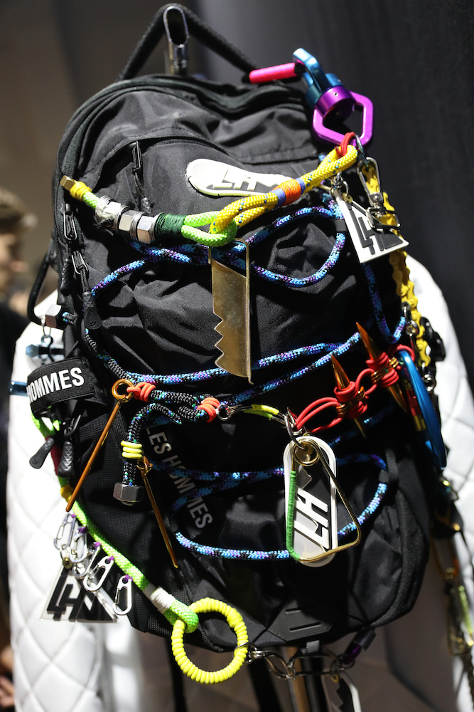 Da Les Hommes, zaino in nylon total black, decorato con corde da arrampicata di colori flou, annodate tra di loro, con moschettoni e rinvii di ogni genere. Per essere pronti a tutto anche in città