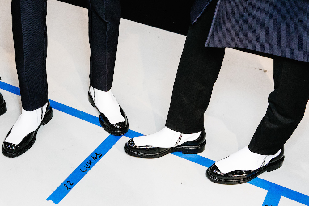 Per la collezione FW19-20 di No.21, Alessandro Dell’Acqua gioca con nero lucido e bianco ottico per i suoi boots in pelle, indossati con pantaloni dritti nei toni classici del blu, del grigio e del beige