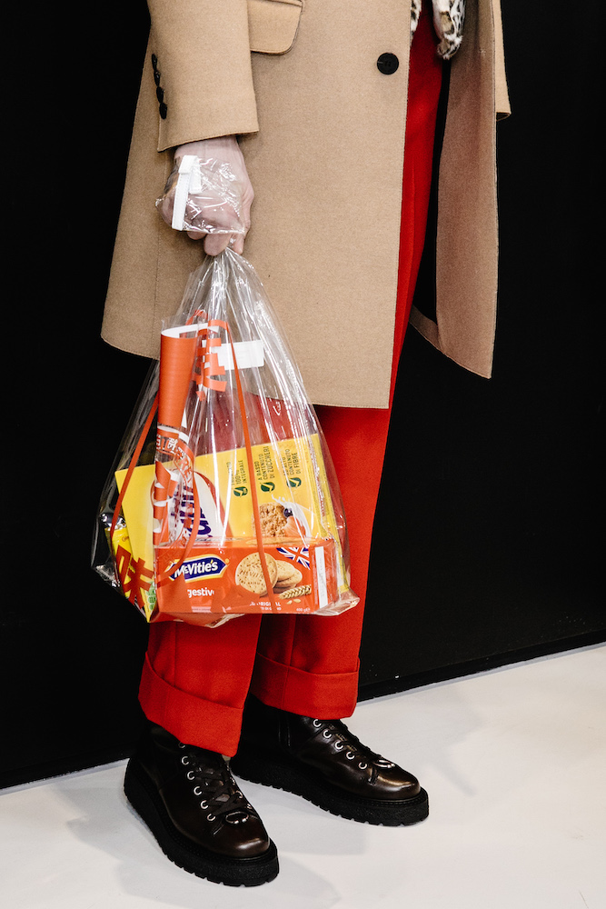 Per il 20esimo anniversario del marchio, Neil Barrett porta in passerella a Milano un nuovo punk. Con borse come shopper in plastica trasparente con all’interno i biscotti Digestive, si cammina tra le stampe della segnaletica al neon di Soho