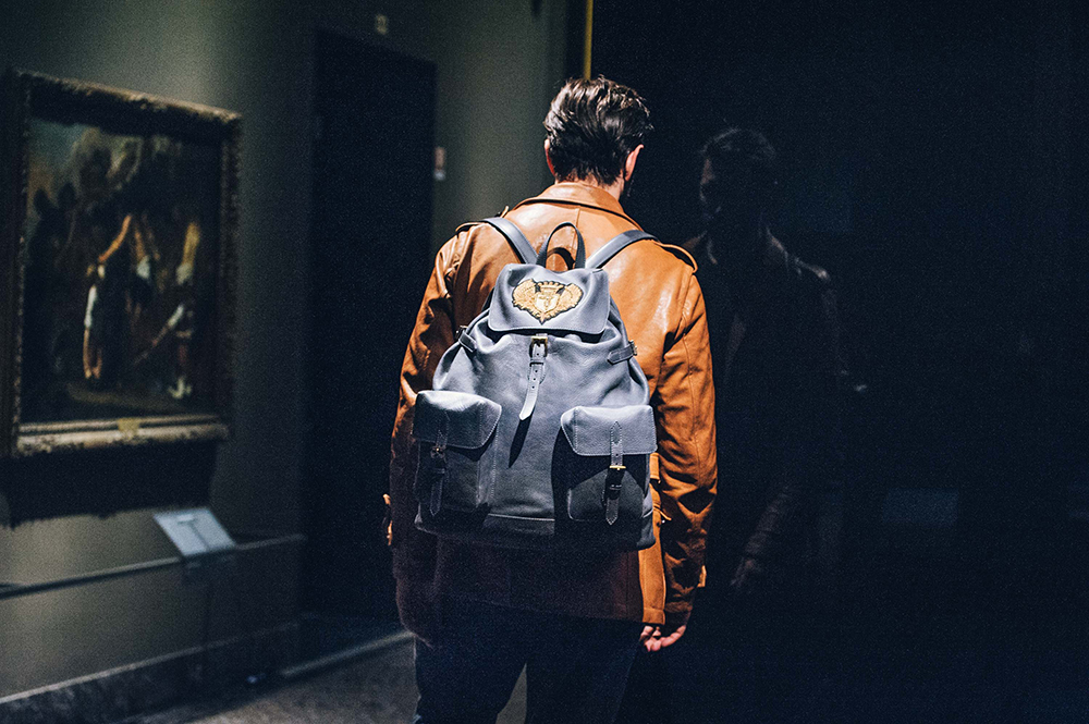 Come il suo abito formale, lo zaino che Trussardi presenta nelle stanze della Pinacoteca di Brera è leggero, morbido e decostruito. Il focus è sulla pelle, cervo testa di moro o nero notte, impreziosita da stemmi araldici a contrasto, con il maxi logo ‘T’ sormontato da una corona in canottiglia.