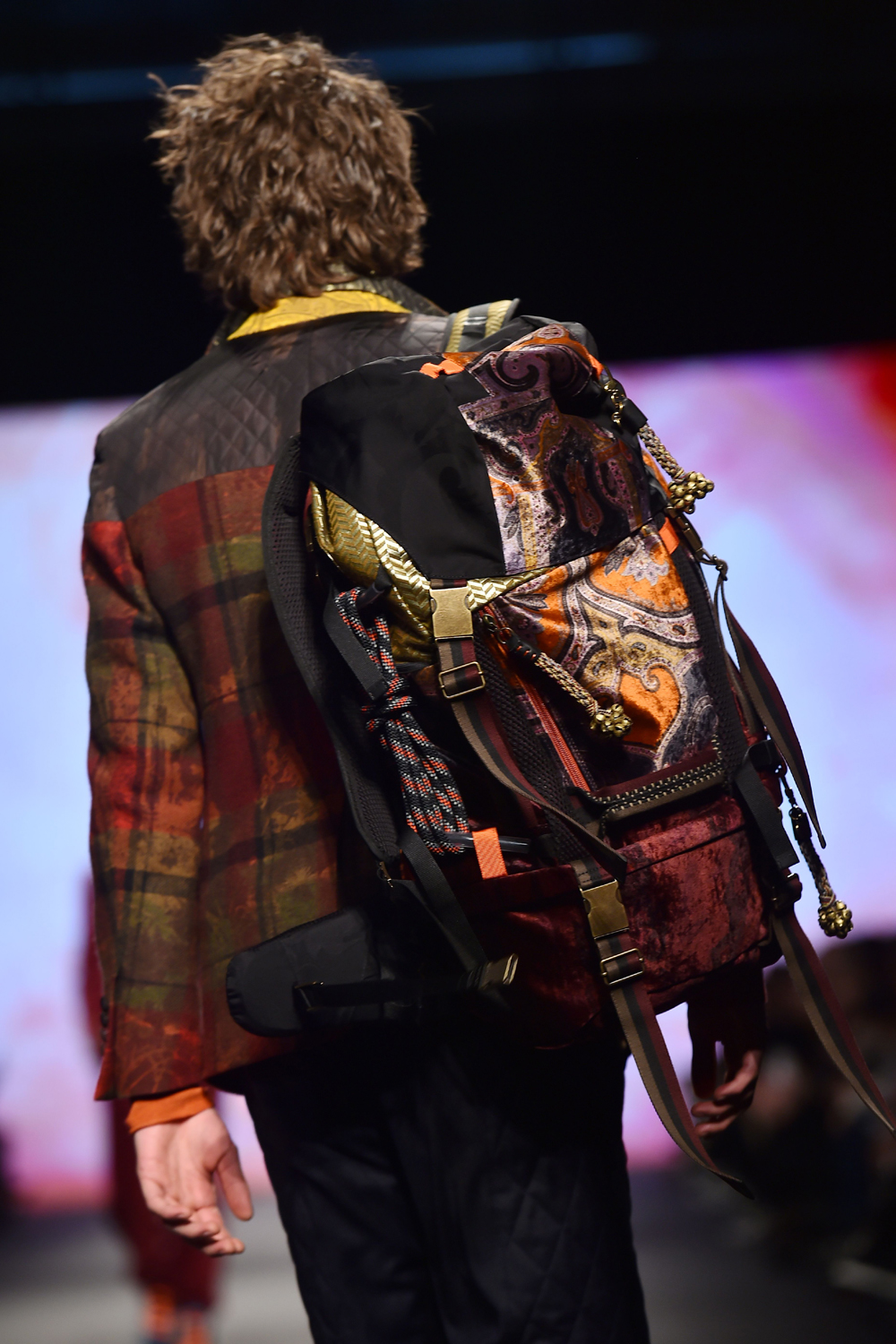 Anche la collezione di Etro rende omaggio alla montagna e con l’hashtag #ETROSkyIsTheLimit ne indaga i miti e la bellezza spirituale. Le lavorazioni naturali di lana e velluto sono in contrasto con il nylon tecnico, caratterizzato da una stampa mélange. Un patchwork riprodotto anche sugli zaini che sembrano composti dai diversi elementi dei capi, come il tessuto delle cravatte, più fitto per resistere meglio all’acqua, che diventa materiale per i pannelli.