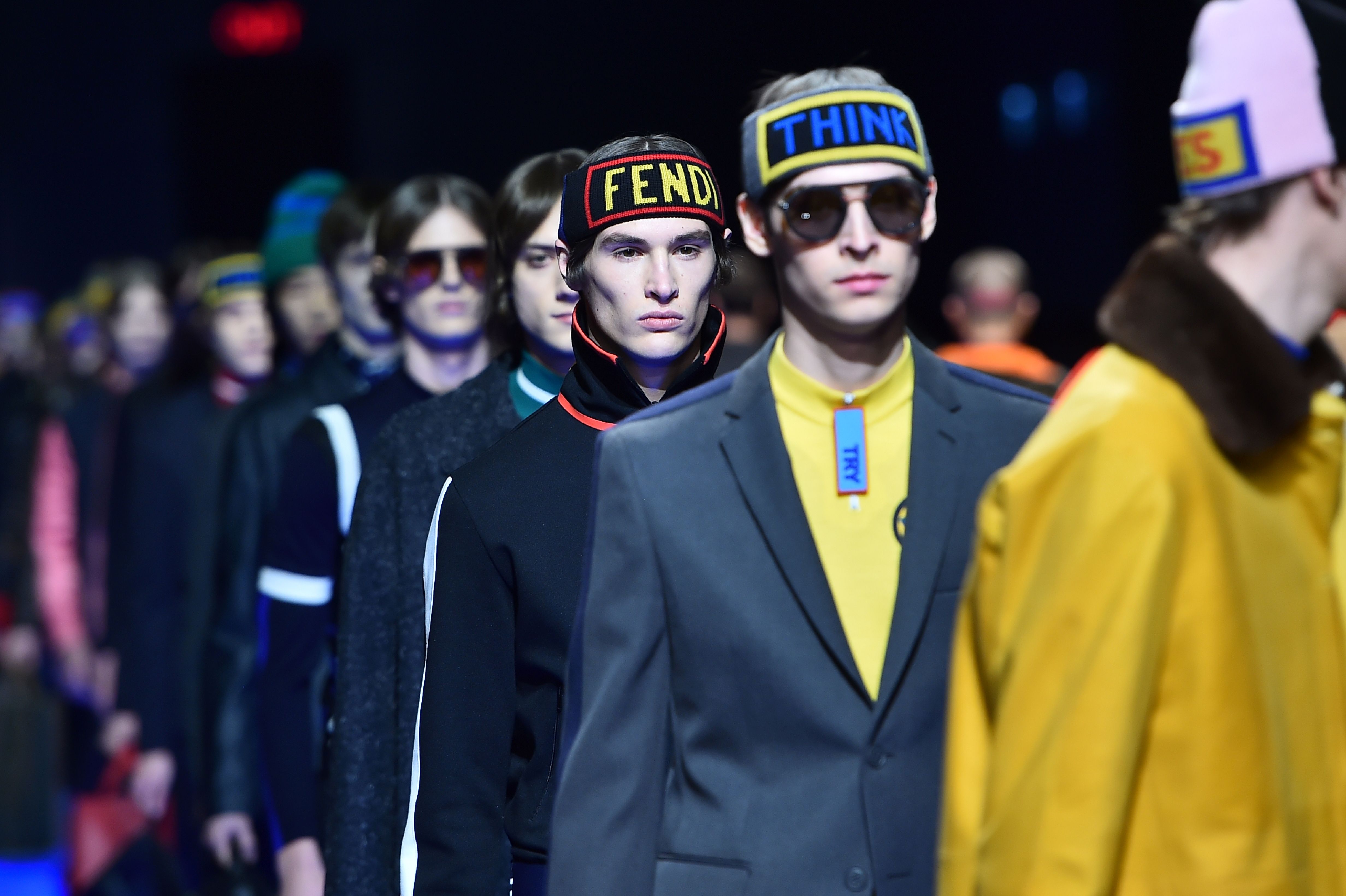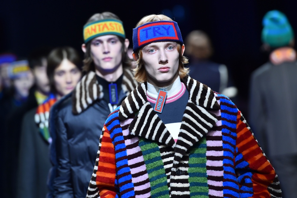 Fendi – Nel nuovo vocabolario di Fendi ci sono parole chiave che parlano agli abiti. Pillole di ottimismo e affidabilità che accendono la collezione maschile del prossimo inverno. “Listen”, sembra dire il cappotto leopardato che debutta per primo in passerella con pantaloni rosa cipria, sneaker ai piedi e tanto di fascetta da sciatore con maxi logo. “Try”, dicono invece blouson, cappotti a cappa con maniche animalier e maglie zippate dalle tinte audaci, rosa, arancio, giallo, che spuntano da blazer cammello, grigi e verdi militare. Gli abiti sono incisi, come slogan dichiarano la loro appartenenza. Fendi viene stapato così a contrasto sul fianco di pellicce lunghe fino al ginocchio, su trench trapuntati on colli leopardati, ciabatte di montone, calzini da running e sulle zip che chiudono maglie in jersey da ciclismo. Una collezione pratica, come l’ha definita la stilista, che pensa al comfort del viaggio, vedi mascherine per dormire e flight pillows, maxi shopping bag in peluche e cappotti come piumoni per un effetto soft bed.
