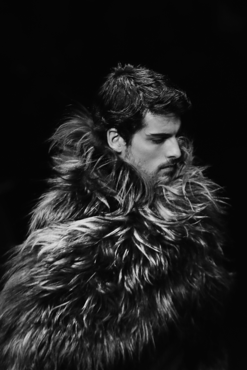 Federico Curradi – Lupus in fabula. Non c’è metafora più aderente a Curradi di questa. Così sulle note del pianista Benjamin Clementine sfila questo Lupo, simbolo di libertà e forza, istinto e tenacia, diviene l’anima della collezione dello stilista che lo disegna in modo ipnotico su coat avvolgenti, blouson in lana cotta, bomber. Parka-vestaglia, cashmere, cappotti morbidi e maglie lasciate non finite, sfilacciate sono le linee guida. Modelli che a piedi scalzi attraversano leggeri la passerella ma allo stesso tempo radicati alla terra. E ancora, maglie in seta su gessati di lana. Tra finito e non finito appare Curradi e la sua poesia di stile.