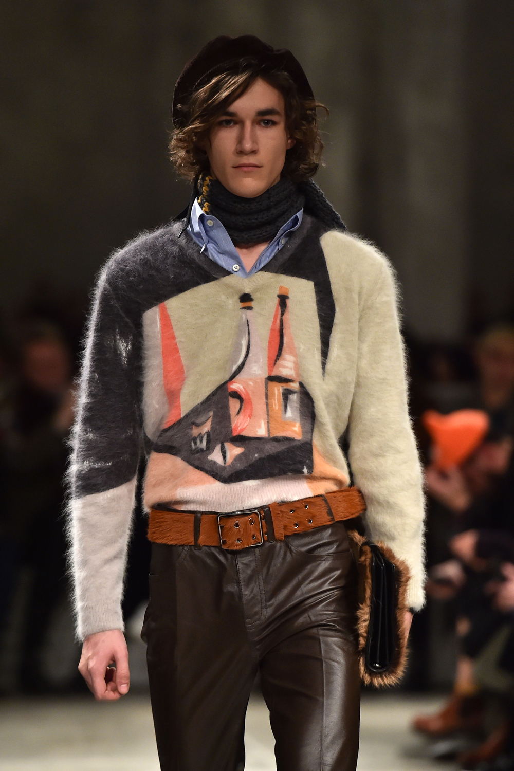 Prada – A casa di Miuccia ci sono letti con lenzuola di pelle carta da zucchero e giallo ocra. Così gli abiti in pelle color cammello, tabacco e cuoio su tortora, senape e rosso. Un gioco di cromie anni Settanta che riportano ai velluti per coat e pantaloni a palazzo su desert boot in cavallino. Maglioni patchwork e pelliccia su cinture e giacconi per il club ‘Prada Get Down’ che corre sul filo del tempo e dai Seventies scorre fino ai bohémienne francesi e alle tenute di caccia inglesi. Pull come tele di Morandi per un rinascimento italiano.