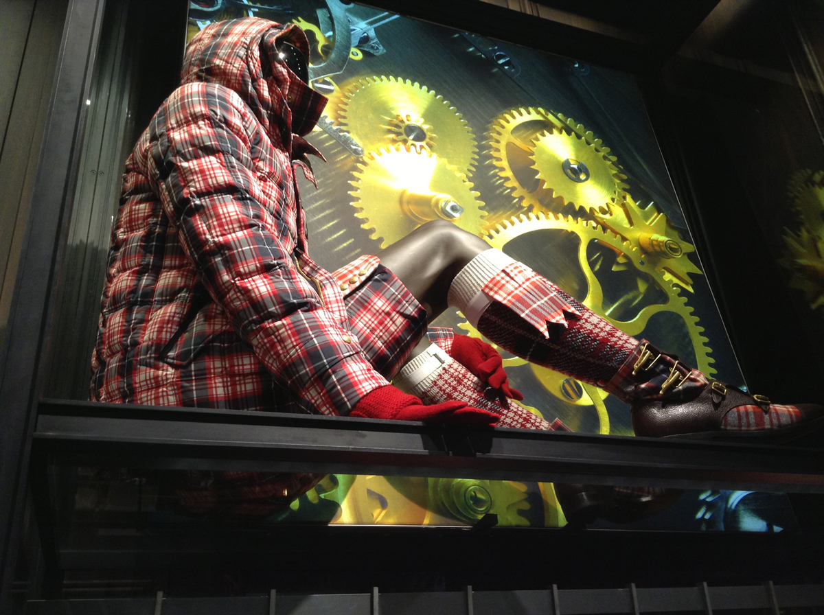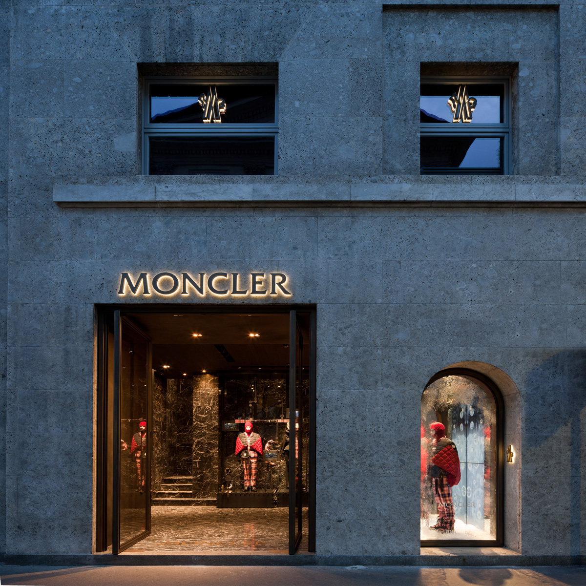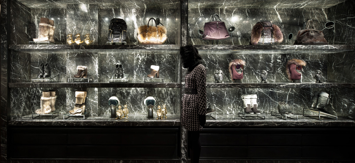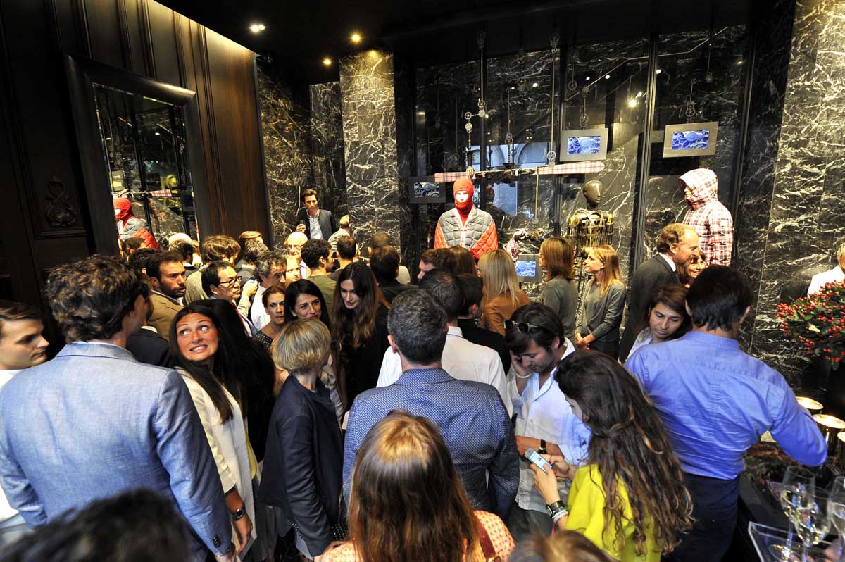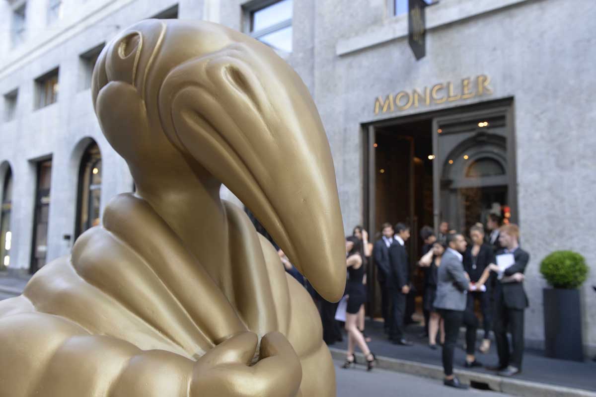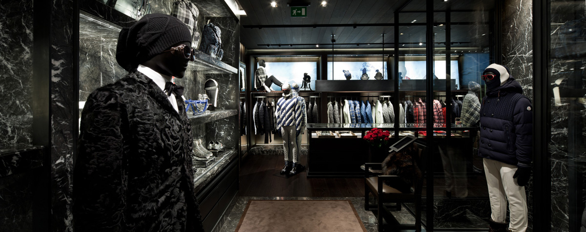 Marmo nero venato di bianco. Il nuovo store Moncler al numero uno di Via Montenapoleone inaugurato durante la settimana della moda a Milano sembra scavato all’interno di una parete rocciosa. Sui due piani gremiti di invitati, manichini-sciatori indossano le collezioni fall winter 2013: Hommes e Femmes, Moncler Grenoble, Moncler Gamme Rouge, la linea di piumini-couture disegnata da Giambattista Valli, e Moncler Gamme Bleu, il menswear firmato Thom Browne. Fuori, davanti alla nuova boutique un Monduck in posa per farsi fotografare da chi non è riuscito a partecipare all’evento. Dentro, a raffreddare gli spiriti di una frenetica giornata all’insegna della moda milanese, mojiti e ghiaccioli firmati Moncler accolgono gli ospiti dell’evento, tra cui Anna Dello Russo, Direttore moda di Vogue Japan e Robert Rabensteiner fashion editor di L’Uomo Vogue. Remo Ruffini, Presidente del brand si definisce soddisfatto ed entusiasta di aver allargato gli spazi destinati all’ampia gamma di prodotti Moncler.
