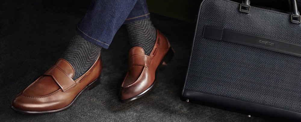 E se Ermenegildo Zegna da prova di sapienza artigianale, con il suo modello dalla classica costruzione a sacchetto, che quindi fonde soletta e tomaia non con la colla, ma con pochissime cuciture, garantendo comunque il confort, tanto da renderlo flessibile, Santoni gli aggiunge delle decorazioni a coda di rondine, segno distintivo di calzature più formali, come le oxford, insieme ad una maxi frangia e alle nappine.