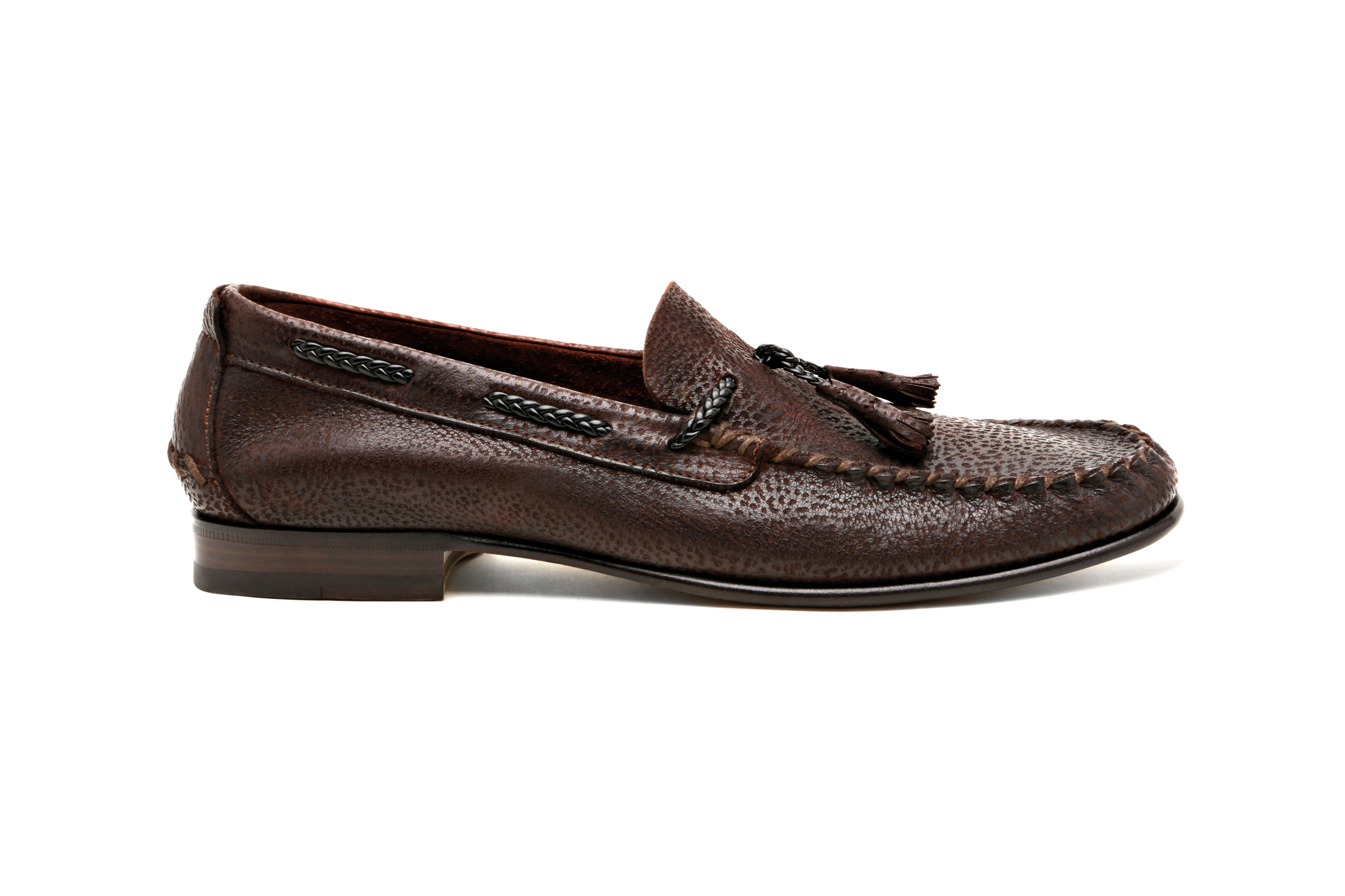 Mocassino Santoni in pelle con texture animalier, con nappine e infilatura passante mignon in pelle intrecciata e cucitura realizzata a mano. Fondo in cuoio. Euro 405