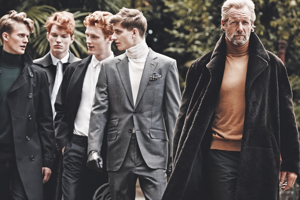 Da sinistra, trench Burberry, dolcevita Tod’s; soprabito in pelle e camicia DSquared2; cappotto, camicia e pantaloni Dior Homme; abito, dolcevita, guanti e pochette Tom Ford; pelliccia, dolcevita e pantaloni Hermès