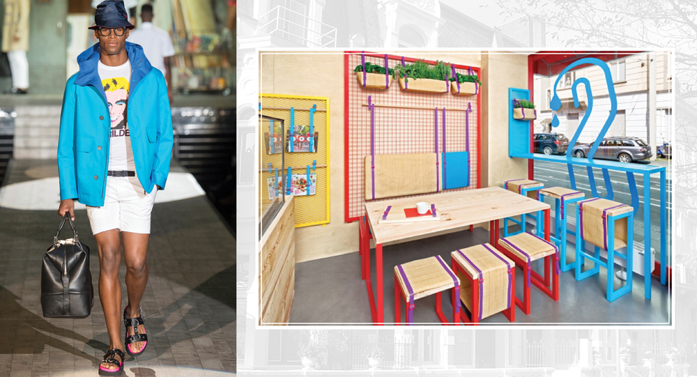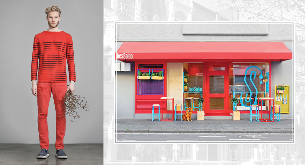 Kessalao, takeaway di piatti mediterranei nella città di Beethoven, Bonn, Germania è l’ispirazione per la gallery di Icon fatta di colori pop e design eclettico. Il nome Kessalao nasce dall’unione di due parole di nazionalità diverse, “Kess” tedesco e “Salao” spagnolo, fresco e divertente. Nonostante si trovi nel nord Europa, l’ambientazione è fresca e colorata proprio come suggerisce il nome, il rosso è la nuance principale che insieme al viola donano un tocco forte all’atmosfera, mentre il blu marino e il giallo ricordano le spiagge mediterranee. Legno di betulla utilizzato per le pareti e pino per l’arredo sono gli elementi chiave di un design green, così come naturali sono i tessuti per il guardaroba maschile dell’estate: lino, rafia, cotone e mescole di seta e chashmere.