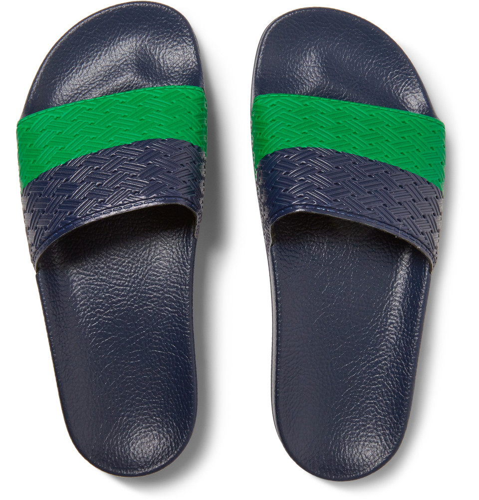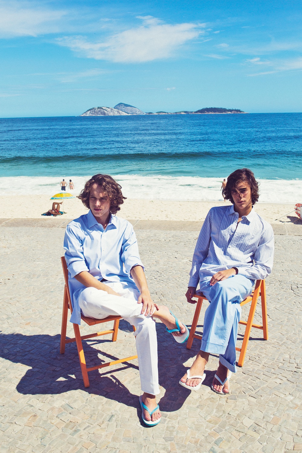 Non solo con il costume da bagno, i modelli in gomma come le più classiche Havaianas si indossano ton sur ton anche con pantaloni di lino o chinos in cotone con risvolto e camicie leggere, dai toni chiari e filati ultraleggeri, come nel servizio moda del numero 21 di Icon. E così vale per le flip flop di Bottega Veneta, in pelle intrecciata artigianalmente con nodino fatto a mano e suola in gomma.
