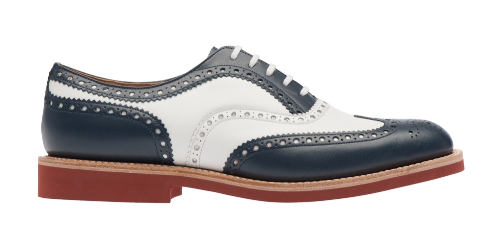 Al posto delle classiche stringate nere lisce, d’ordinanza con il completo blu, è concesso per la bella stagione optare per delle oxford bicolor, meno impegnative ma ugualmente d’impatto.