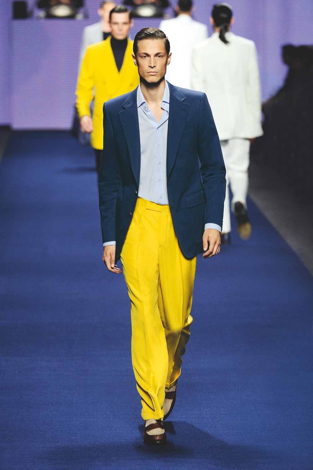 Etro usa il giallo limone dei pantaloni in cotone con tasche posteriori a filetto per accendere un blazer blu portato sopra a camicie leggere come veline, mentre Canali incornicia il volto del nuovo gentleman di primavera con girocolli in cotone grosso lavorato a costine.