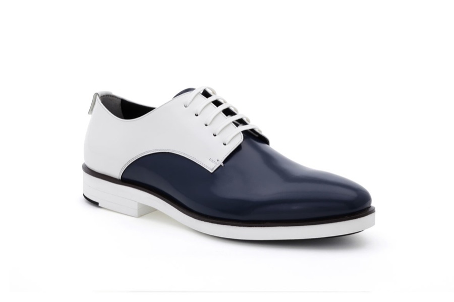Derby stringata di Fendi ha tomaia bicolor in vitello spazzolato bianco e blu navy con lacci e suola abbinate, impunture a vista e linguetta sul tallone. Da portare con denim blu scuro (press office)