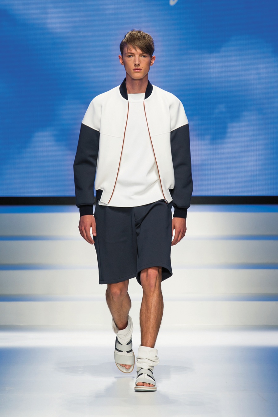 Total look Salvatore Ferragamo. Il bluson in jersey bianco e blu ha maniche, chiusura zip a contrasto, polsini e colletto in maglia (press office)
