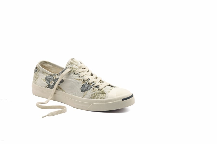 Sneaker Jack Purcell di Convers in canvas con stampa a fiori su fondo bianco. Ha suola in gomma e puntale con l’iconico smile a contrasto