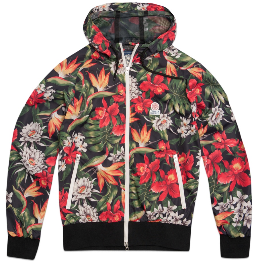 Giubbino Franklin & Marshall in tessuto tecnico wind stop con stampa floreale, cappuccio, polsini e fascia girovita in maglia di cotone a contrasto. Da portare su outfit total black