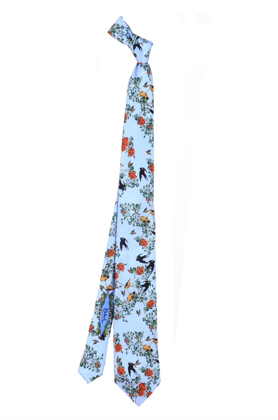 La cravatta 100 per cento seta di Kinloch ha stampa con ispirazione giapponese e fondo azzurro carta da zucchero. Si annoda attorno a colletto francese