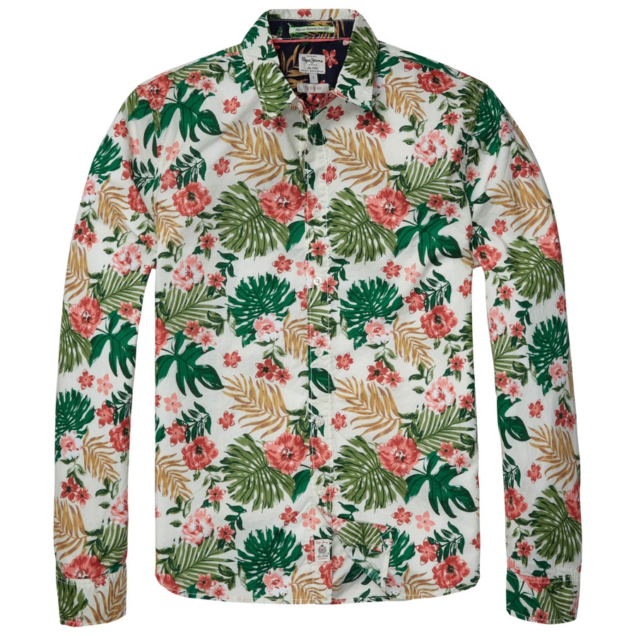 Camicia di cotone Pepe Jeans London con stampa Hawaiana su fondo bianco. Ha colletto con vele aperte, da indossare sotto a blazer blu monopetto o con denim scuro