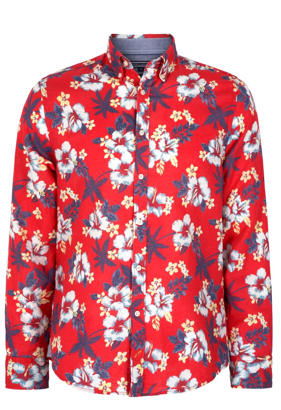 Colletto botton down e stampa con tiarè, fiore simbolo della Polinesia. La camicia in cotone misto lino di Tommy Hilfiger ha fondo rosso, stampa a contrasto e tessuto denim all’interno del colletto