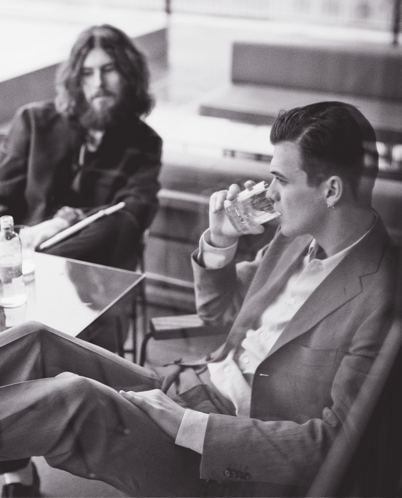 A sinistra, polo e pantaloni Corneliani, cintura e scarpe Dolce&Gabbana. A destra, giacca, T shirt e jeans Brioni, scarpe Dolce&Gabbana e occhiali Saint Laurent by Hedi Slimane