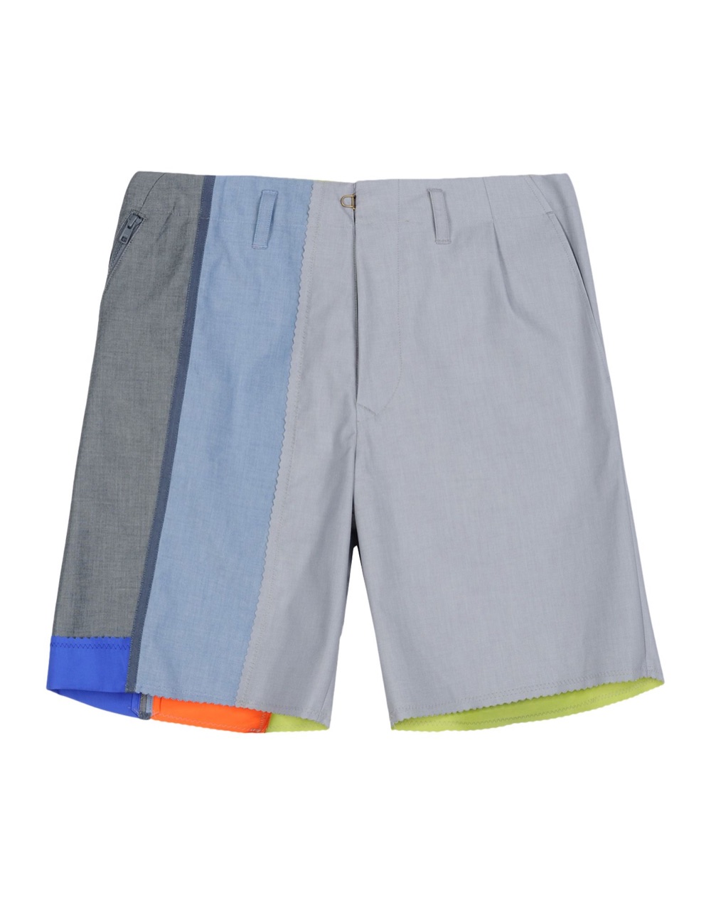E al mare? I bermuda a pieghe dalla silhouette minimale hanno righe di colore inatteso, a suggerire il technicolor che in quegli anni prese piede sugli schermi e nelle opere d’arte. Sono lampi di colore neon, che si intravedono nel tessuto interno e su un lato. Discreti, ma capaci di farsi notare.