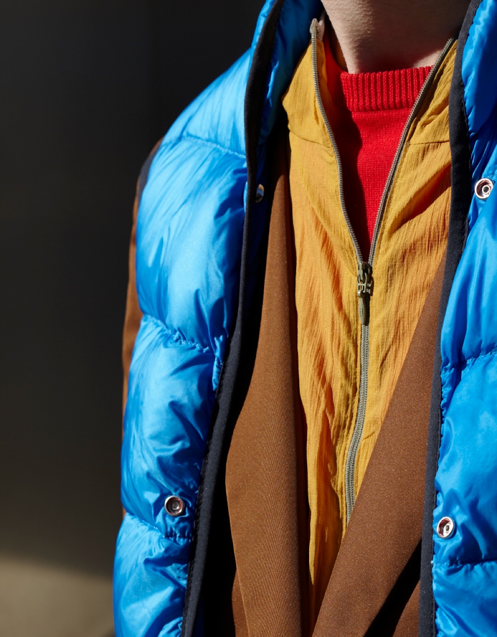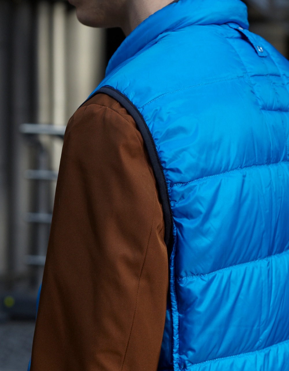 Il duvet smanicato è un pezzo chiave per il look formale di stagione. Di tradizione outdoor non disdegna infatti un posto nel guardaroba del businessman. Merito di uno spessore ridotto, che cela sotto la superficie un leggero strato di piuma iniettata. E di certe lavorazioni prese a prestito dal tailoring maschile, come le profilature in tessuto. L’accostamento con i toni bruciati del tabacco e del caramello esalta la cromia decisa.