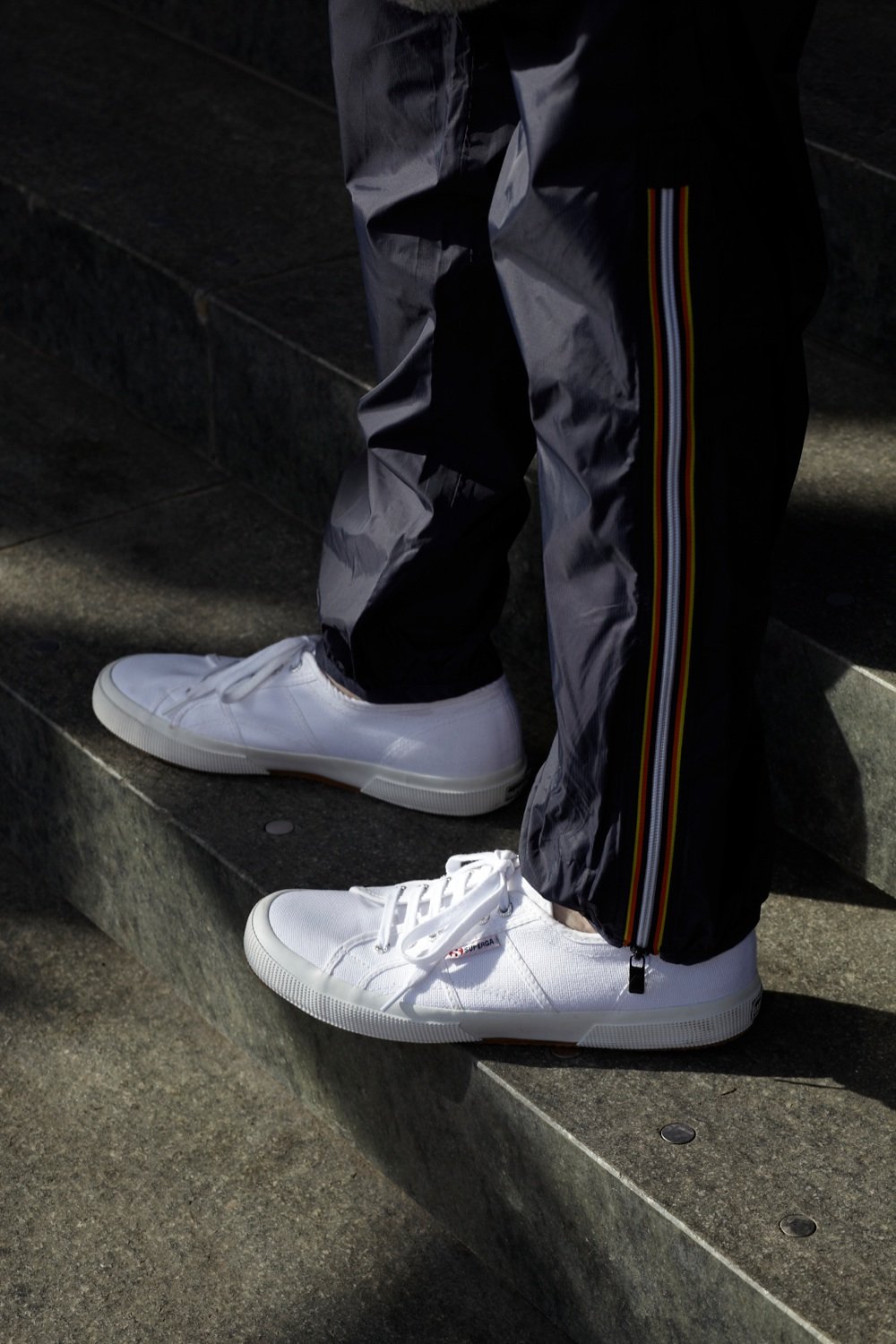 Armonia degli opposti: la giacca sartoriale e i pantaloni in nylon con elastico in vita. Questi ultimi modellati secondo la grammatica della recente tecno-couture. Sfoderati e waterproof, svelano la parentela con lo storico k-way nelle bande a profilo sulle tasche e nei dettagli di più stretta derivazione atletica. Non mancano dettagli ad alto tasso performante come le cuciture termosaldate al fondo con collaretta antigoccia.