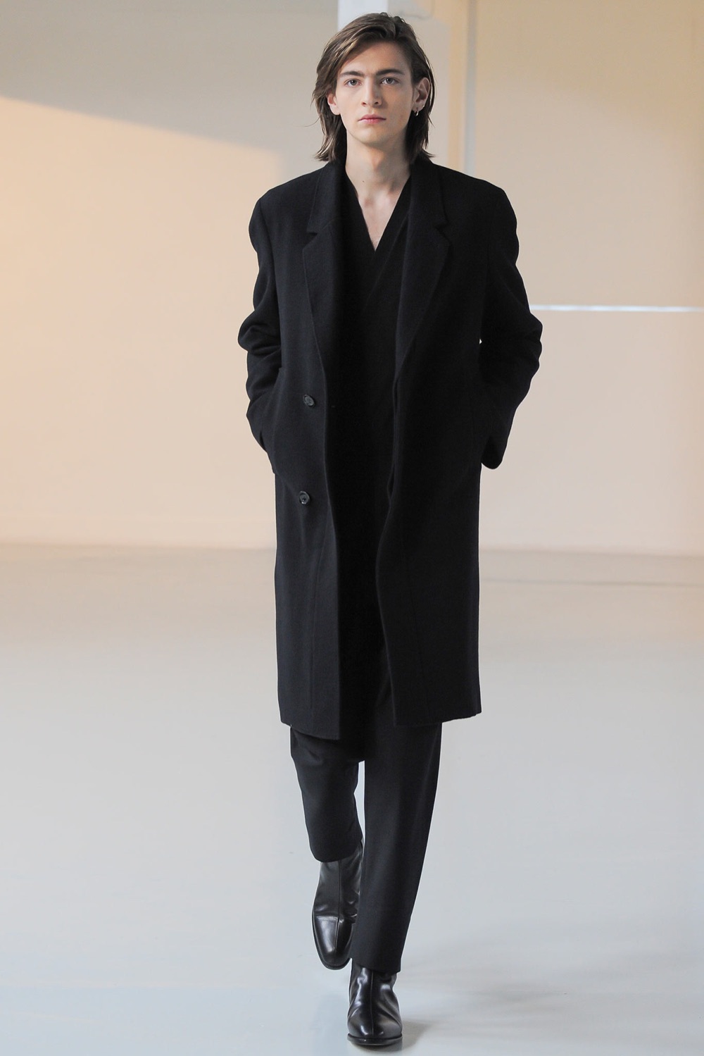 Infine, Lemaire: il suo uomo passeggia solitario sulla Rive Gauche negli anni settanta, la sua religione è il total black, i cappotti in lana sono avvolgenti, e si indossano con pantaloni slim, e maglieria raffinata: uno stile esistenzialista che porta subito alla mente la melodia sensuale e malinconica di Je suis venu te dire que je m’en vais di Serge Gainsbourg.