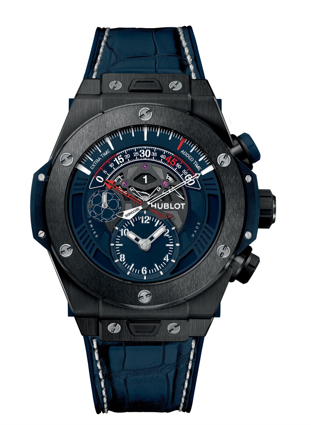 Hublot dedica il suo nuovo Big Bang Unico Retrograde Chronograph alla prestigiosa UEFA Champions League e festeggia il suo nuovo status di orologio ufficiale. Il cronografo è in dizione limitata a cento pezzi, contiene il movimento Unico retrogrado, ha cassa 45 mm in ceramica nera rivestita del blu delle notti che contraddistinguono le partite di Champions ed è abbinato a un cinturino in alligatore blu cucito su caucciù con impunture bianche.