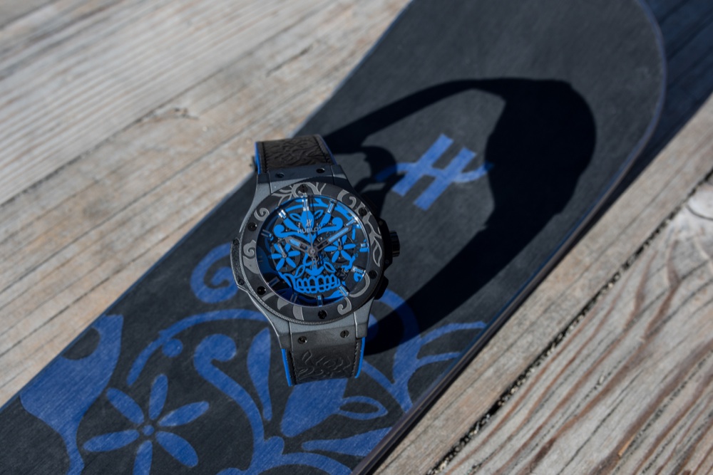 Dedicato agli appassionati della neve, il nuovo Big Bang Sugar Skull di Hublot si ispira alle orme arabesche lasciate dagli sciatori. Con le montagne come sfondo è la storia di una nuova amicizia.che unisce Hublot, Bischoff e AK SKI. La fusione di tre tradizioni di expertise svizzera che condividono gli stessi valori: passione, high performance, innovazione, alti standard, creatività e divertimento. Il fine pizzo di San Gallo – arte ancestrale firmata dalla maison svizzera Bischoff – e gli sci di AK SKI i loro alter ego, lamine nere impreziosite da arabeschi floreali, con solette colorate e racchette assortite, svelano fieramente il teschio simbolo di Hublot inciso nel caucciù.