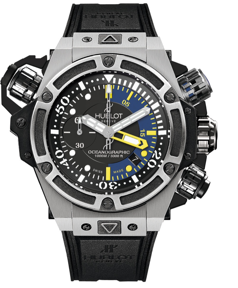 Per chi ama le profondità ecco il Cronografo King Power Oceanographic 1000 di Hublot, dedicato ai sub. Ha cassa 48 mm in titanio satinato, vetro zaffiro con trattamento antiriflesso, lunetta in titanio satinato e micropallinato, movimento cronografico a carica automatica HUB4160, quadrante blu e nero opaco e cinturino in caucciù con fibbia in titanio (ma anche un cinturino aggiuntivo in caucciù e nomex per le immersioni).
