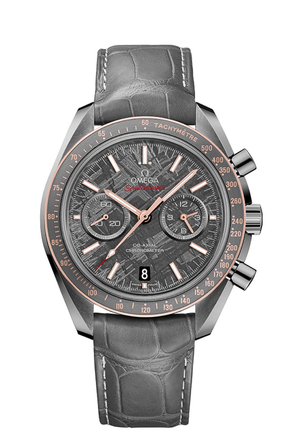 Gli orologi da indossare questo autunno hanno il colore della terra o di quel grigio shark skin tanto caro alla cartella di Pantone Fashion Report per la stagione in arrivo. È il caso del nuovo Speedmaster Grey Side of the Moon “Meteorite” di Omega con scala tachimetrica realizzata per la prima volta in Ceragold, tecnica che permette di decorare le parti in ceramica dell’orologio utilizzando oro 18k. Ha ghiera in oro Sedna 18k circondata da un anello in nitruro di silicio, più resistente e leggero della ceramica. Ma la caratteristica principale dell’orologio è il quadrante in meteorite ricavato da una porzione di pietra extra-terrestre. Si tratta del meteorite Gibeon caduto in era preistorica in Namibia che i nativi del luogo lo usavano per creare armi e utensili. Più recentemente il fascino di questo meteorite di ferro è stato premiato dai designer per il suo classico pattern Widmanstätten che fa riferimento a delle lamelle intersecanti che sono riscontrate in questo tipo di meteoriti dopo un’incisione con l’acido.