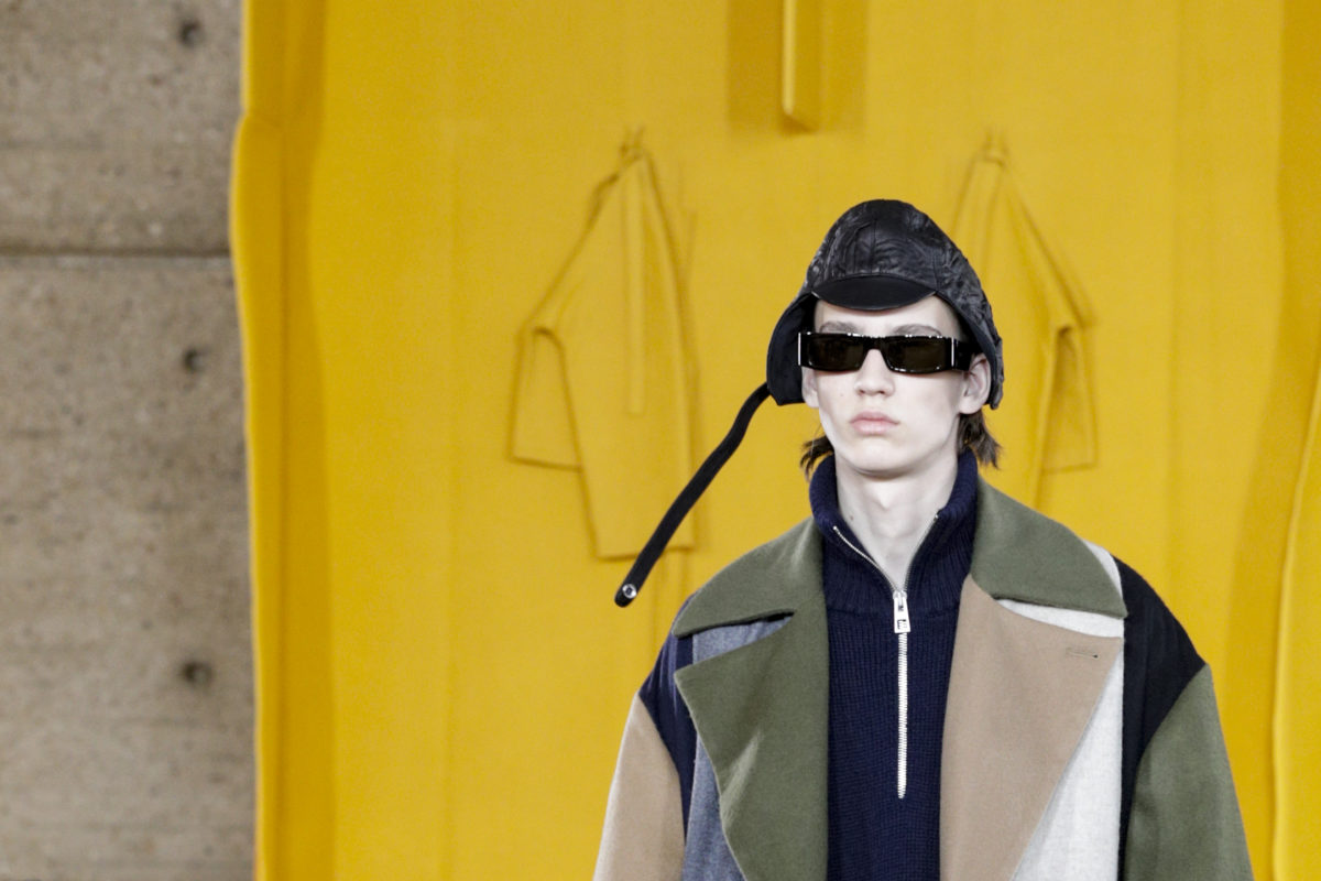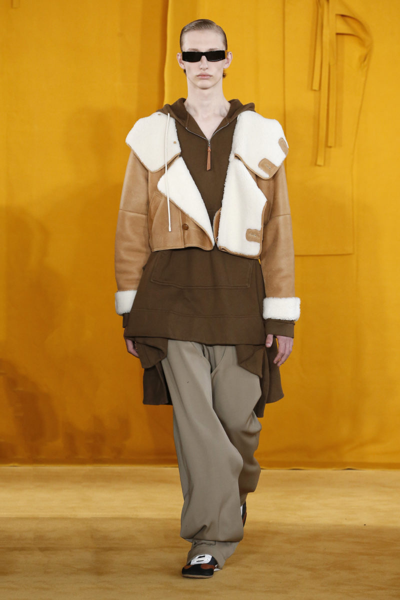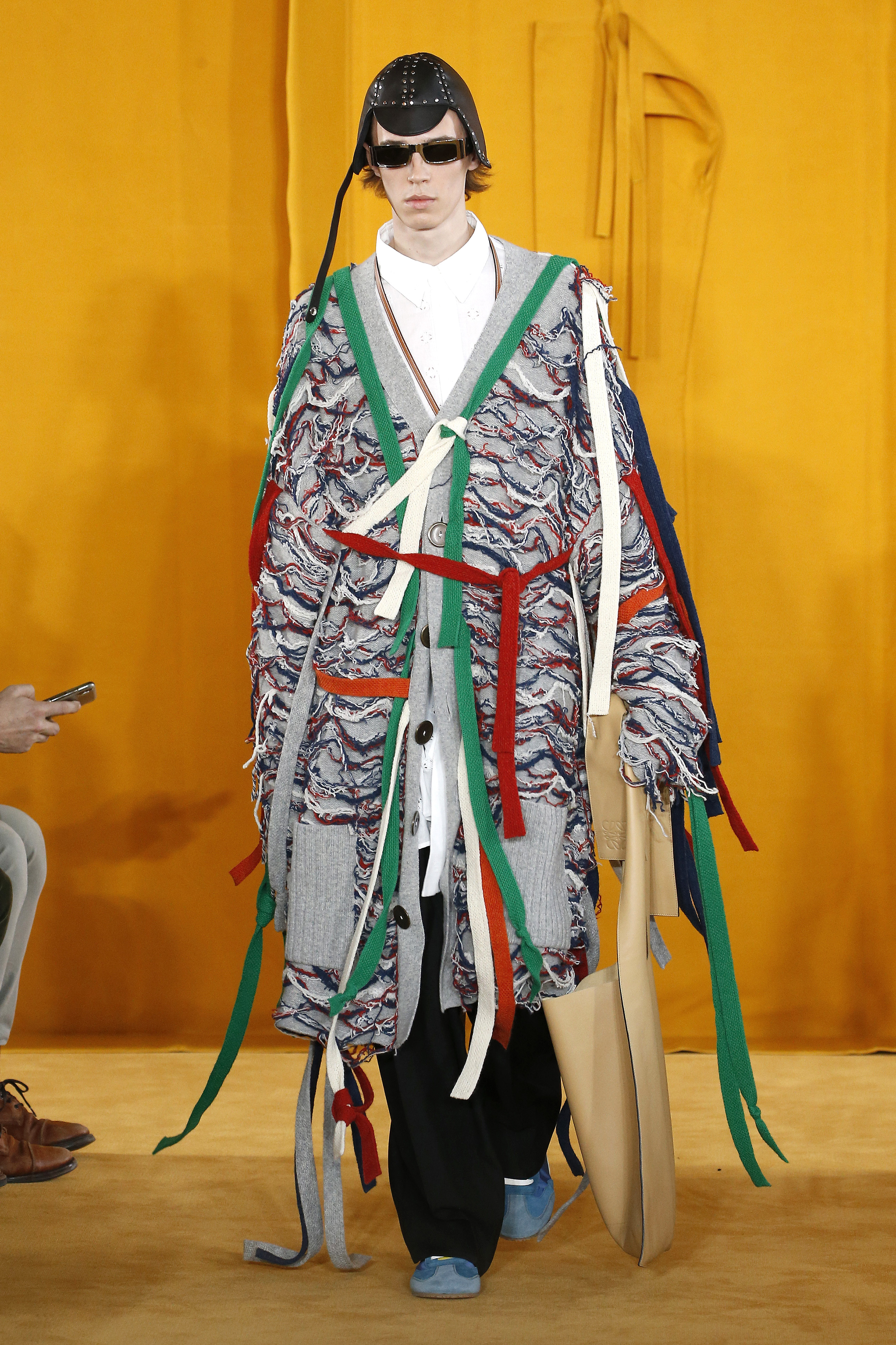 Stivali da pesca lasciati aperti, maglie che sembrano ritagli di tappeti, cappotti con inserti in shearling, cashmere, cammello e tuniche ispirate alle coperte da campeggio. Jonathan Anderson, direttore creativo di Loewe, che per la prima porta sfila, riconsidera costruzioni e proporzioni in un guardaroba in cui sartorialità e sport di squadra entrano in conflitto. Le tinte sonopastello, poi sfumano nei toni del matellassè e chiudono con il blu, come il doppiopetto in cammello indossato a pelle.
