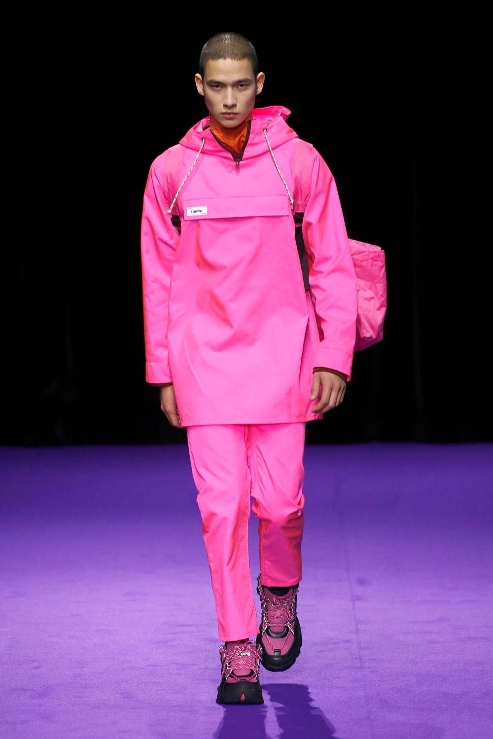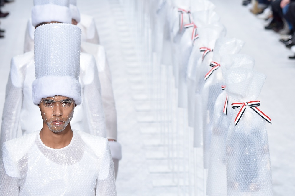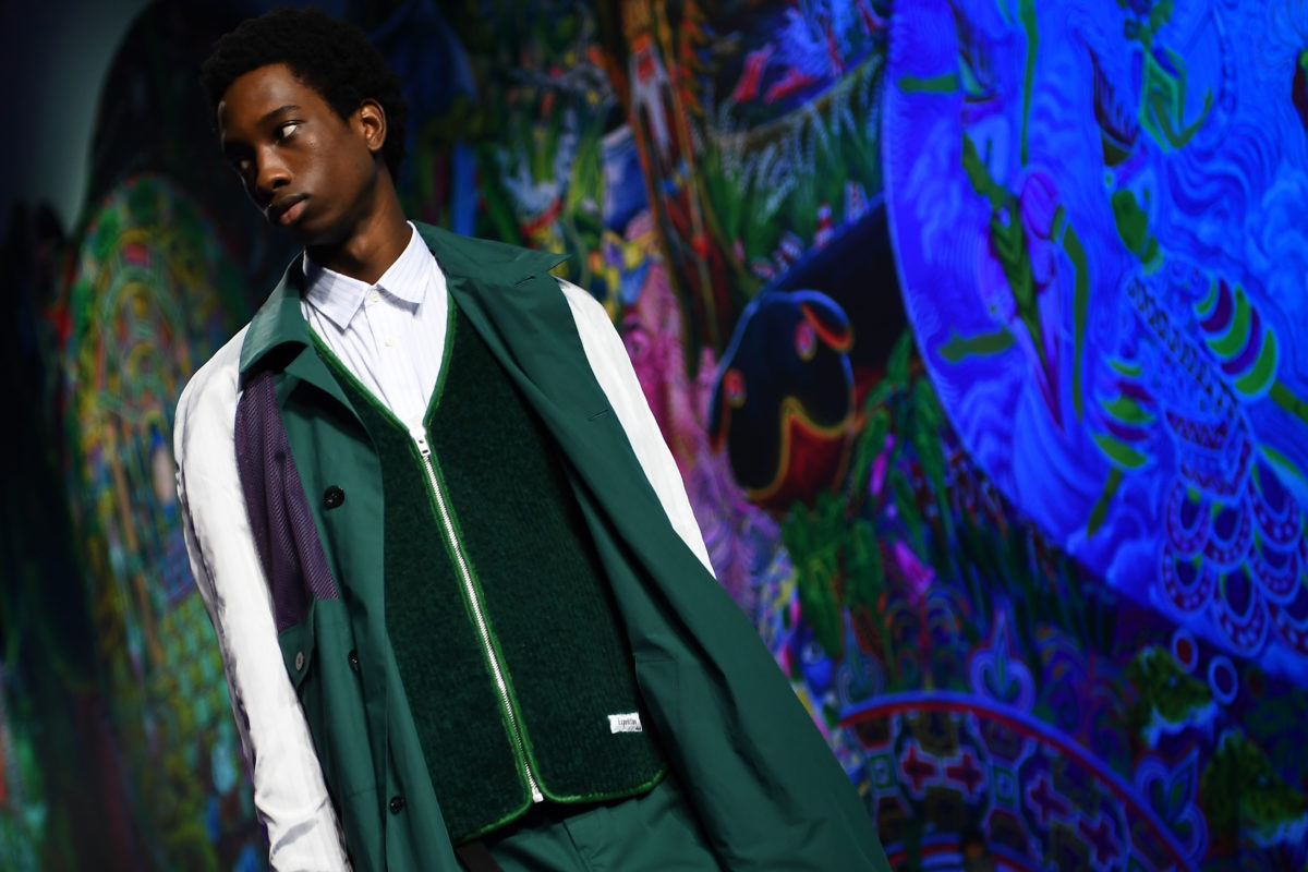 Design, Function, Technology. La nuova collezione di White Mountaineering si può definire in tre parole. Yosuke Aizawa porta in scena abiti mutanti e stratificati, due, tre quattro volte, avvolti in imbragature chiuse con doppie fibbie che sembrano progettati per le scalate estreme. L’obiettivo, stare al caldo. Ecco quindi che i giubbotti si sovrappongono a cappotti in tweek, le camicie di flanella si abbottonano sopra a maglioni d’impronta nepalese, gli shorts da trelkking s’infilano sopra a pantaloni in nylon chiusi alla caviglia con strap di velcro. Le collabo, anche qui, non mancano. Con adidas per le sneker da trekking, con Milllet per i piumini imbottiti , con Eastpak per gli zaini da montagna multiaccessoriati.