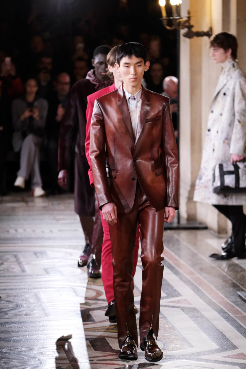 Il primo look della sfilata di Berluti annuncia a gran voce il tema della sfilata disegnata da Kris Van Assche. Un abito sartoriale forgiato da quel pellame lucido che è caratteristica inconfondibile delle classiche scarpe di cuoio della maison. Affascinato dai vecchi piani di marmo su cui gli artigiani tingono a mano le scarpe presso lo stabilimento di Berluti a Ferrara, Kris Van Assche riproduce le macchie multicolori del marmo nella sua collezione. Il rosso, il giallo, il blu e il verde donano un colore intenso ai capi, definendoli in modo unico e irripetibile. Le macchie ritornano anche nelle stampe delle camicie di seta e nelle borse di nylon in pelle esotica.